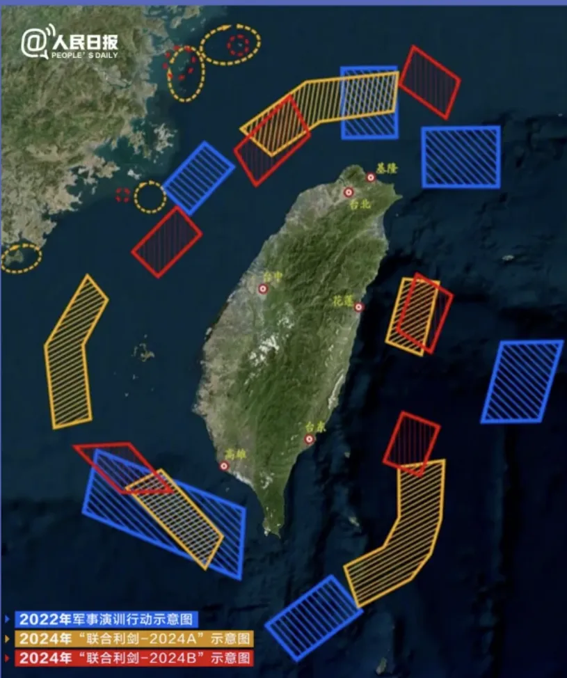 2022年至2024年,历次围台军演划设演习区域示意图。(图源:人民日报)