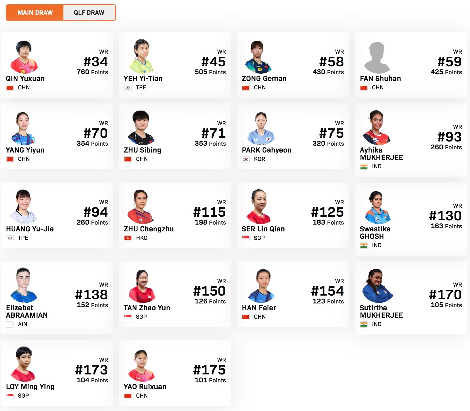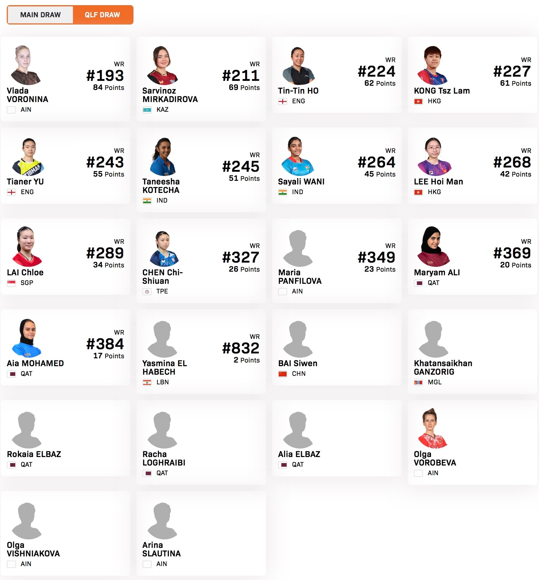 WTT支线赛多哈站女单参赛名单比赛时间:2026.1.27-1.31正赛:覃予萱🇨🇳,叶伊恬(中国台北),纵歌曼🇨🇳,范姝涵🇨🇳,杨屹韵🇨🇳,朱思冰🇨🇳,朴佳贤🇰🇷,A穆克吉🇮🇳,黄愉偼(中国台北),朱成竹🇭🇰,舒麟茜🇸🇬,戈什🇮🇳,阿布拉米安AIN,陈昭澐🇸🇬,韩菲儿🇨🇳,S穆克吉🇮🇳,黎明映🇸🇬,姚睿轩🇨🇳资格赛(部分):沃罗尼娜AIN,米尔卡迪洛娃🇰🇿,何天天🏴󠁧󠁢󠁥󠁮󠁧󠁿,江芷林🇭🇰,于甜儿🏴󠁧󠁢󠁥󠁮󠁧󠁿,科特查🇮🇳,瓦尼🇮🇳,李凯敏🇭🇰,黎嬣萱🇸🇬,陈琦媗(中国台北),潘菲洛娃AIN,白思文🇨🇳