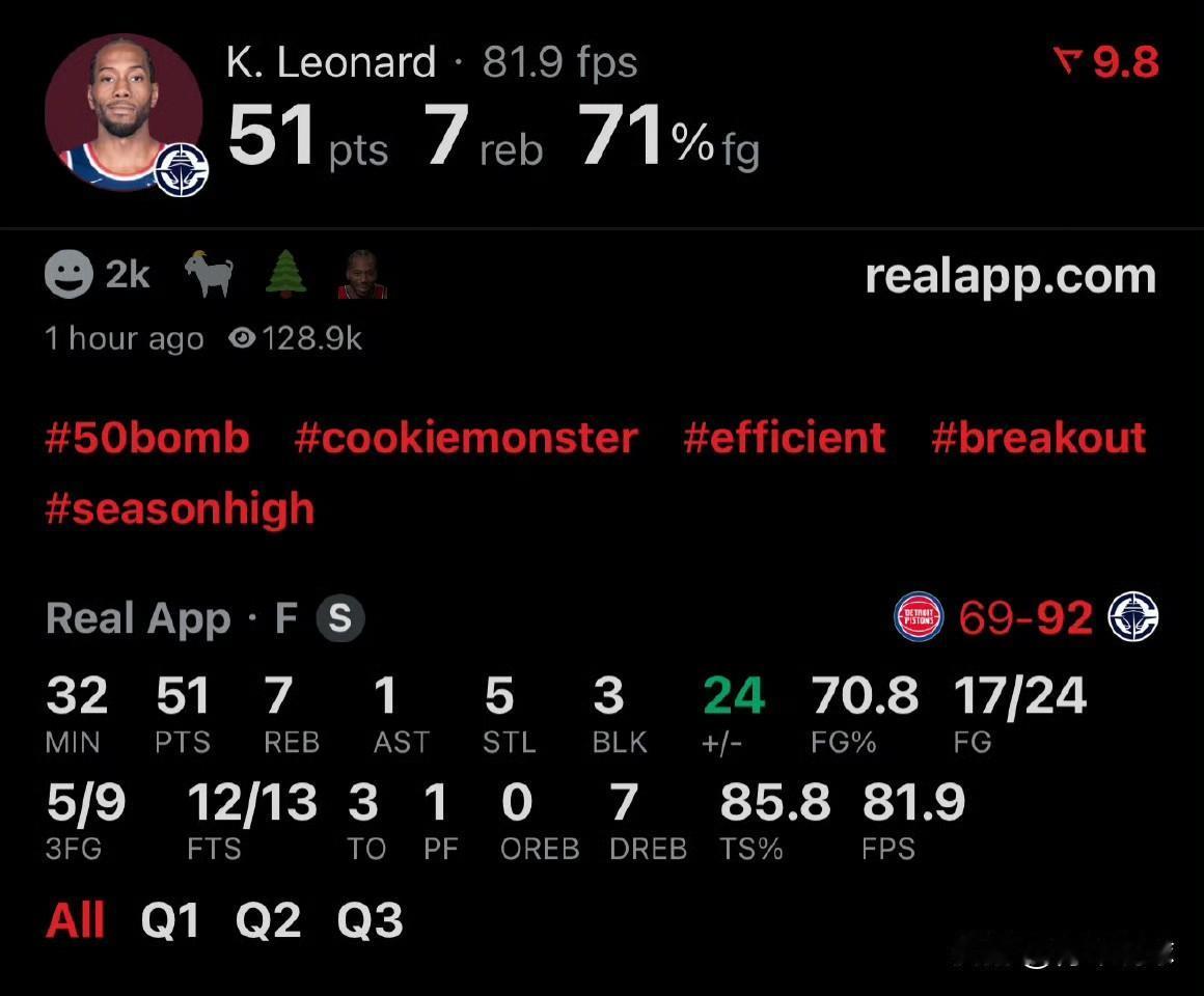 MVP呼声响起!伦纳德三节51分! 今天,快船队坐镇主场迎战活塞队,他们力争在主场延续连胜。伦纳德的表现依旧是快船队能否赢球的重要保障,他在上半场得到25分3篮板4抢断2盖帽,还在防守端成功限制了坎宁安,帮助球队取得了18分的领先优势。 更夸张的在第三节,面对活塞队的疯狂反扑,伦纳德单节狂轰26分,以一己之力压制着活塞队的进攻狂潮。三节结束,伦纳德已经得到了51分7篮板5抢断3盖帽,命中率高达71%。在伦纳德走上罚球线时,主场球迷向他送出“MVP”的呐喊声,这是他对近期表现的最大认可!
