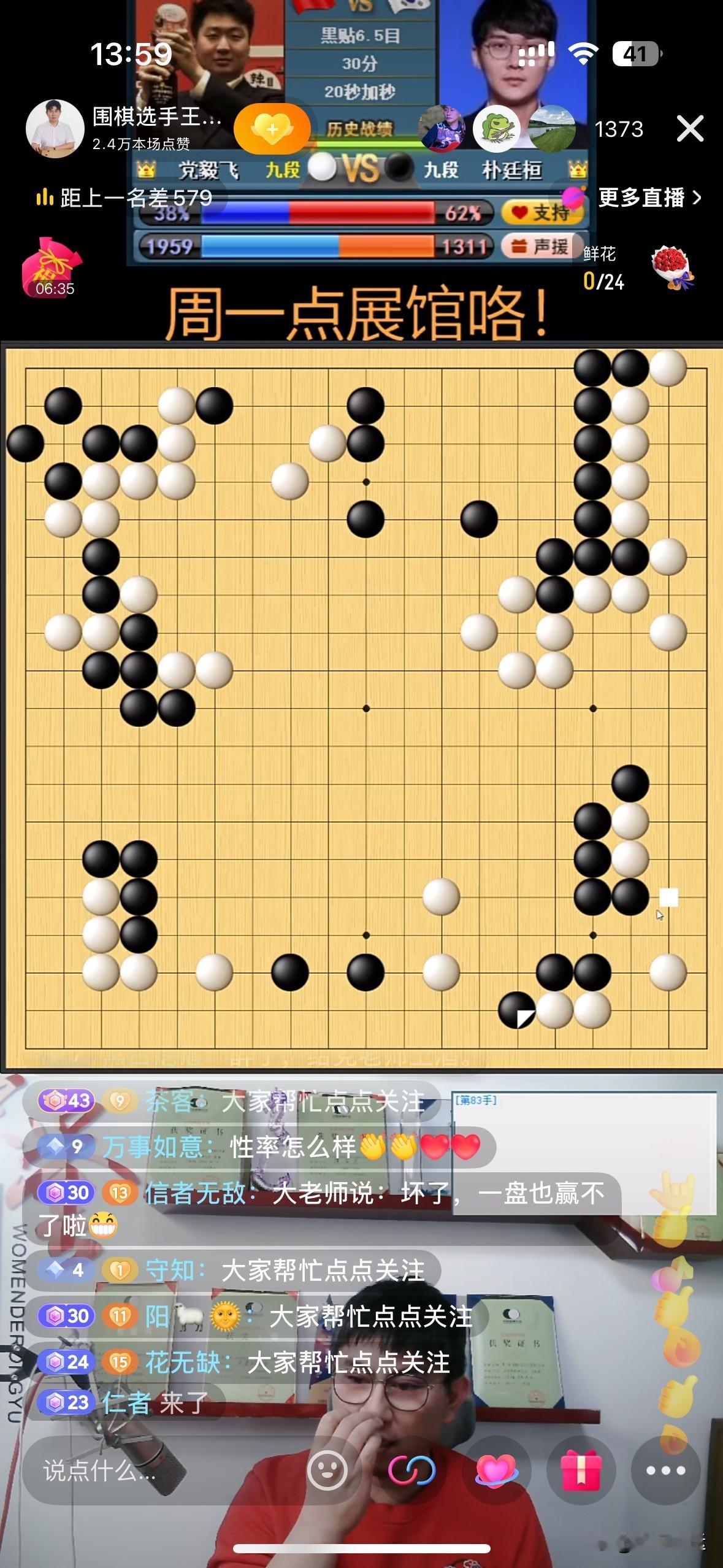 首届世界棋仙战半决赛第二场比赛最新战报🔥🔥 中国选手党毅飞执白对阵韩国的朴廷桓。从最新AI给出的胜率来看,黑棋也就是朴廷桓那边有53%的胜率,这说明局势还是很胶着的。 围棋这东西,不到最后一刻都不知道谁能笑到最后。党毅飞那也是实力强劲的棋手,说不定这会儿正憋着大招呢。朴廷桓肯定也不敢掉以轻心,每一步都得精打细算。希望党毅飞能稳住局面,来个绝地反击,逆转获胜,让我们这些棋迷好好见证一场精彩的胜利!