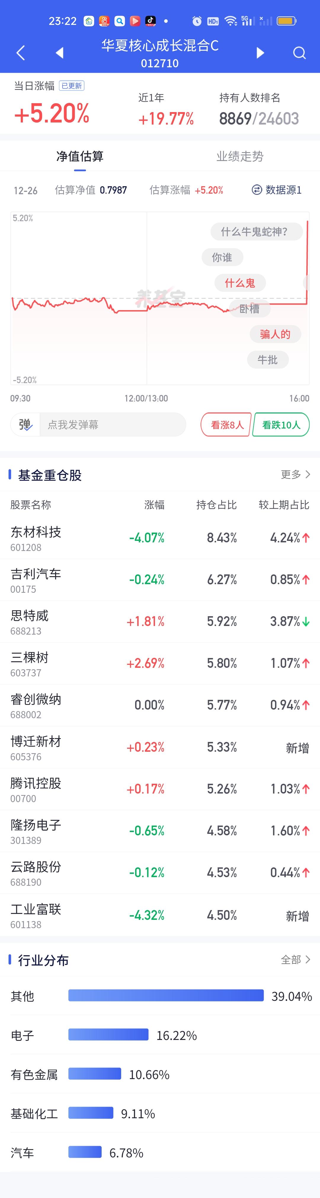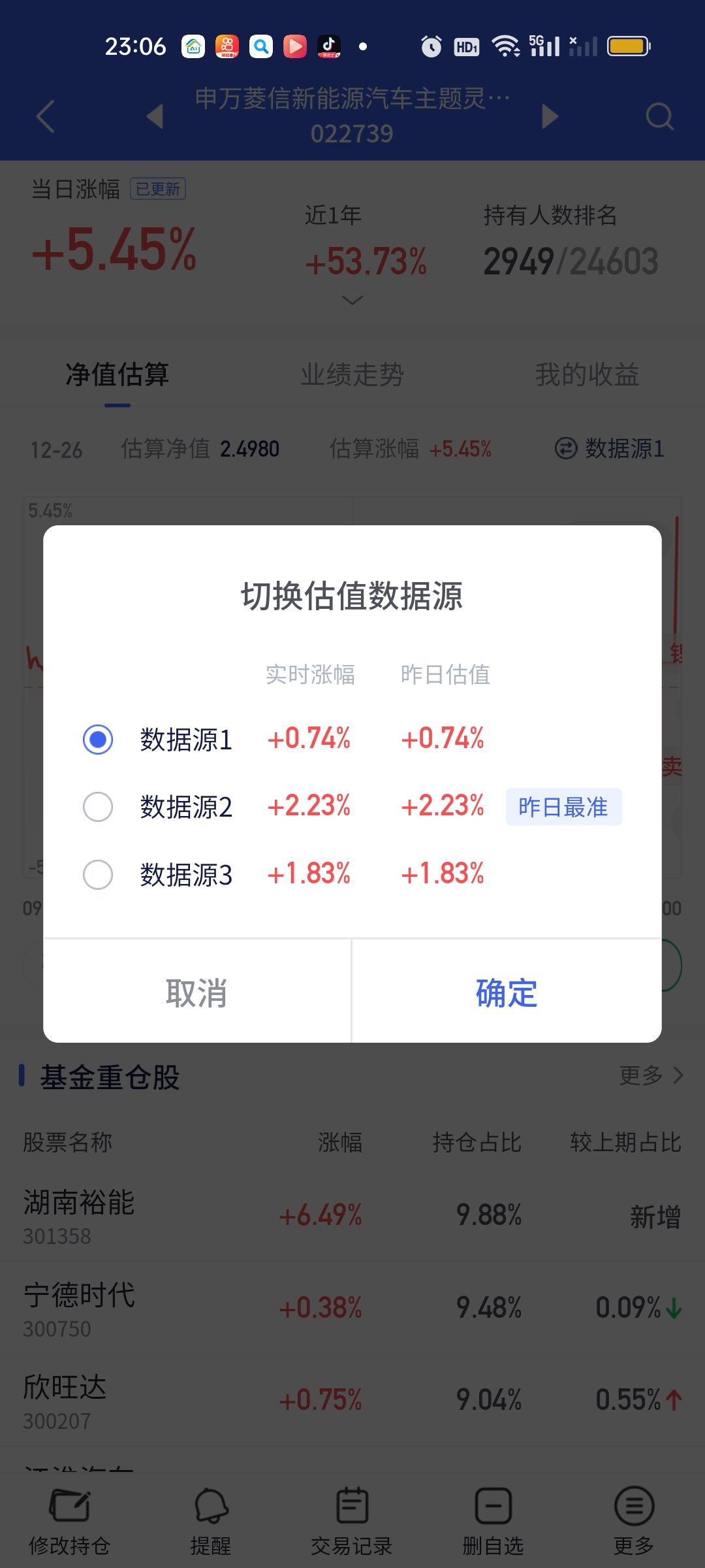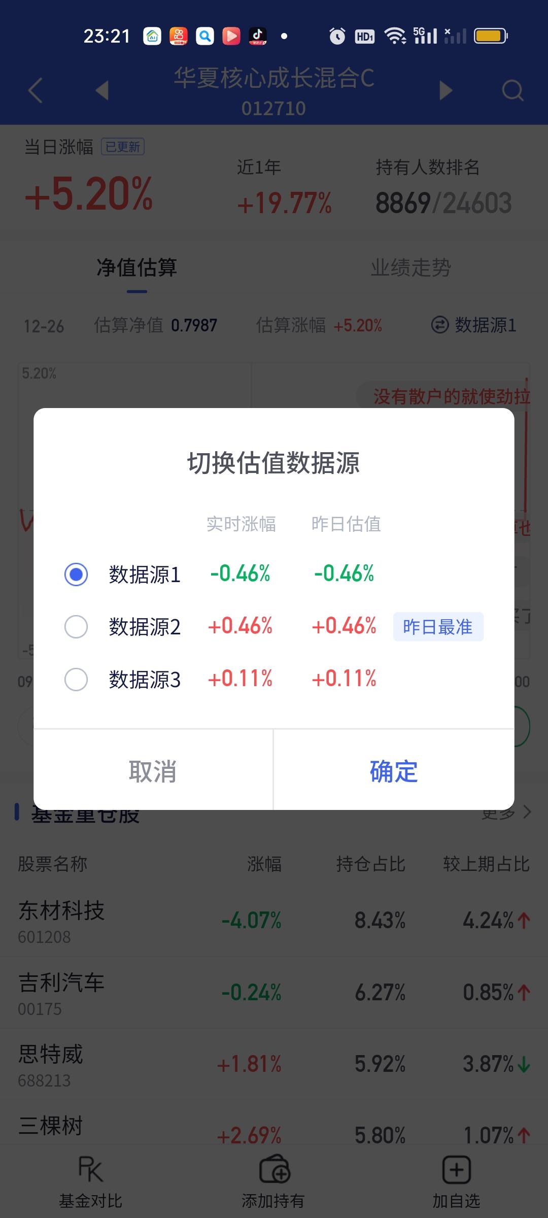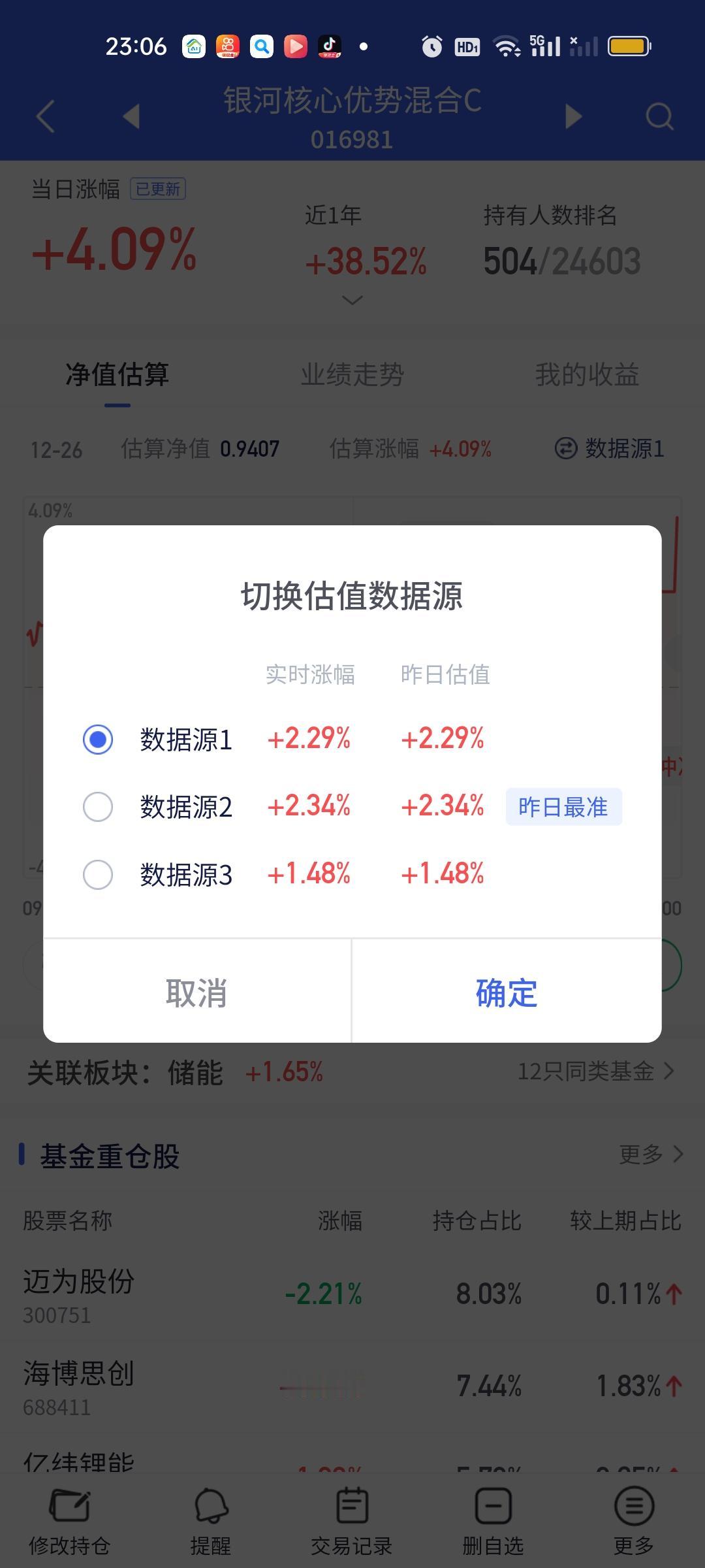 说到超级高开,今天申万菱信新能源汽车和华夏核心成长真的让人开眼了!申万菱信新能源汽车预估涨0.74%开出来涨5.45%,直接翻了接近8倍。看持仓能涨2个点就满顶了,那只有一个可能,大概率是调仓换股了。 还有这个华夏核心成长,预估跌0.46%结果开出来涨5.20%,看持仓应该是要开绿的,应该也调仓换股了,而且这两只基金大概率调到一个方向去了。另外银河核心优势今天也高开了1.80%。