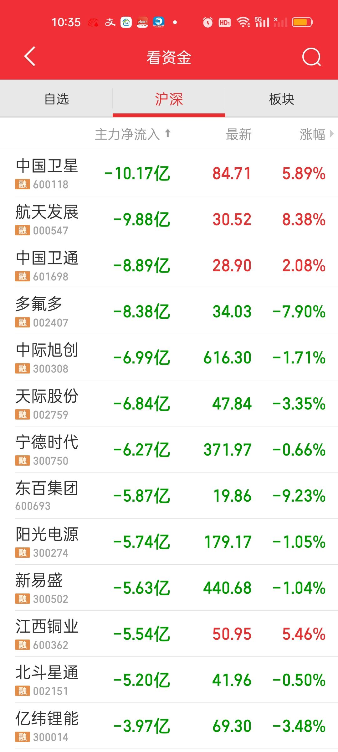 量能没啥问题,但盘面走的很割裂。开盘1个小时成交量放量接近1000亿,量能是没啥问题的,但资金净流出了441.70亿,而且个股是涨少跌多,跌停的个股也有接近20只。这并不是什么好现象。 寒武纪流入资金最多,也是唯一过10亿的,反倒是中国卫星,航天发展,中国卫通净流出资金位居前三,流出都在9亿以上,但股价又都是红的,不能排除有人高位派发筹码呀,一旦承接不够,小心翻绿。