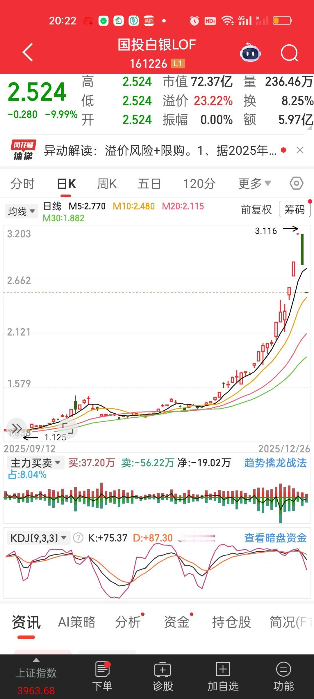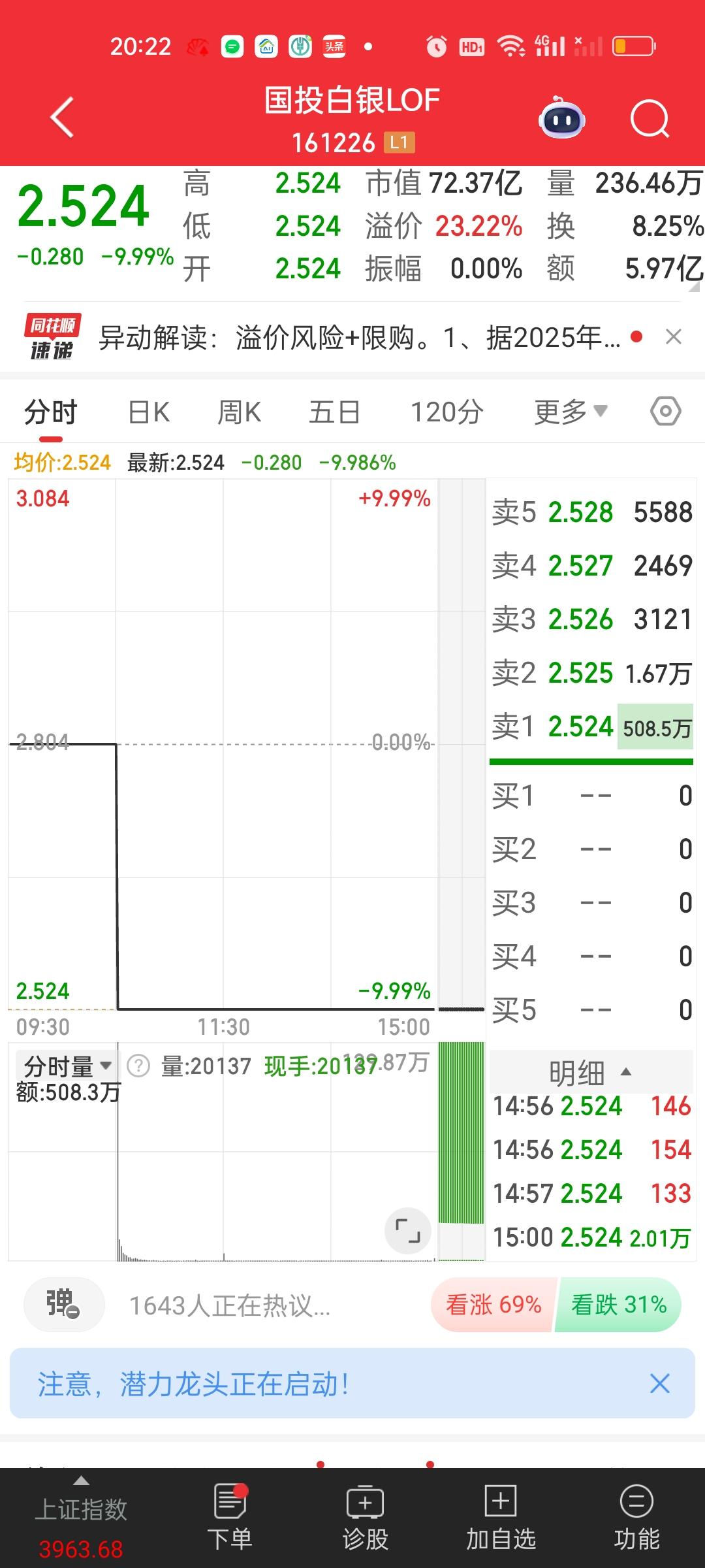 众所周知LOF基金有两套价值体系,一套是场外净值,就是基金的真实净值。按照持仓资产计算出来的。一套是场内价格,也就是股票市场买卖的价格,由供需关系决定。正常情况下这两个价格会差不多,但当情绪失控,买盘蜂拥而至,场内价格就会被资金硬生生顶上去。远远脱离实际净值。 国投白银LOF场内的溢价高达68%,所以市场上有很多人用它来套利,国投瑞银白银期货A类目前每天只能限购500元,500元的68%就是340元,也就是说500元每天可以套利340元,理论上你家里有4个证券号,每个号每天在场外买入500元。 然后第二天场外转场内证券账户直接把它卖出。你单日最少可以套利340*4=1360元。这个操作绝对是可行的,网上也有很多实战教程。很多人从月初就开始套利,20多天已经套利几个W。 当然风险也应声而至,周四和周五连续两个跌停以后,目前场内基金的溢价已经从68.19%降低到了23.22%,假设下周一继续跌停,那溢价就将彻底抹平。