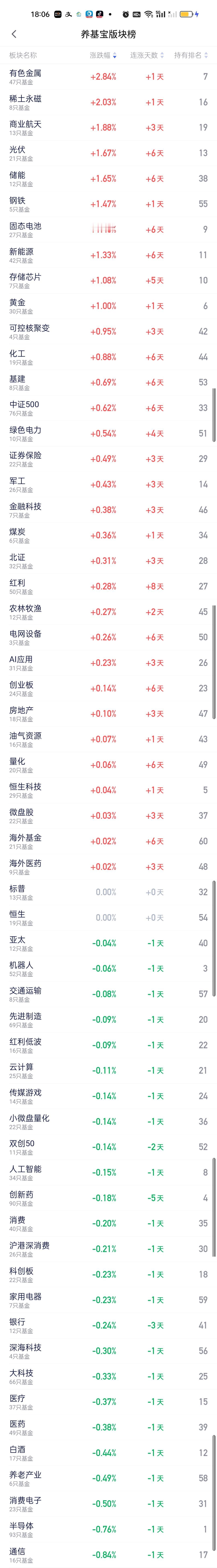 今日基金加仓榜前三名是国投瑞银白银期货,华泰柏瑞质量成长,鹏华碳中和,减仓榜前三名是永赢先锋半导体,嘉实中证稀土产业,天弘中证光伏产业指数。 持有榜发生了很大变化,先锋从第一变成了第三。前五依次是国投瑞银白银期货,中航机遇领航,永赢先锋半导体,永赢先进制造和永赢科技智选。 板块涨幅榜排名靠前的是有色金属,稀土永磁,商业航天,光伏,储能,钢铁,固态电池,新能源,存储芯片,黄金,可控核聚变。