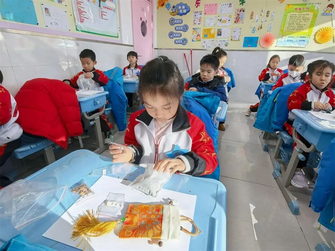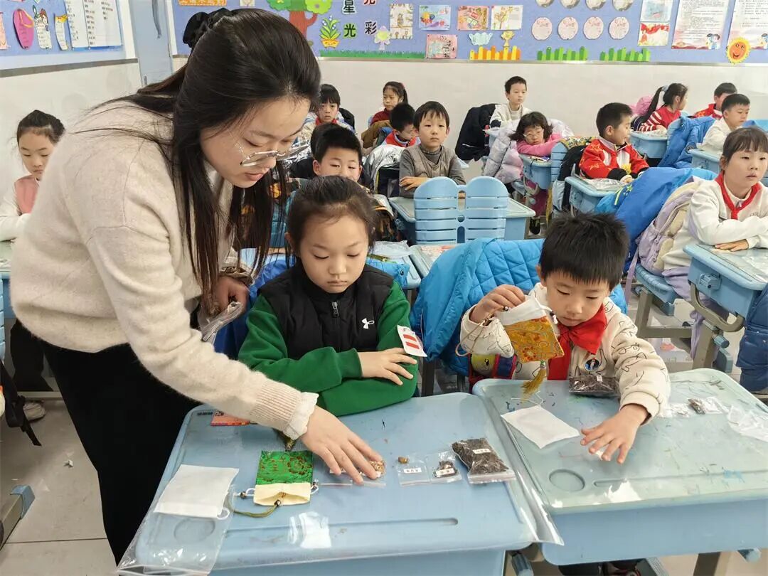 北校区一至二年级的活动同样精彩纷呈。孩子们率先开启预防感冒香囊的制作之旅,提前分好的紫苏、白芷、香附等药材,让低年级学生的操作变得简单易行。在视频教学的指引和辅导老师及班主任的贴心指导下,大家认真填充药材、系紧香囊袋,不一会儿,一只只散发着淡淡药香的香囊就完成了。孩子们兴奋地展示着自己的作品,迫不及待要带回家和家人分享这份健康心意。
