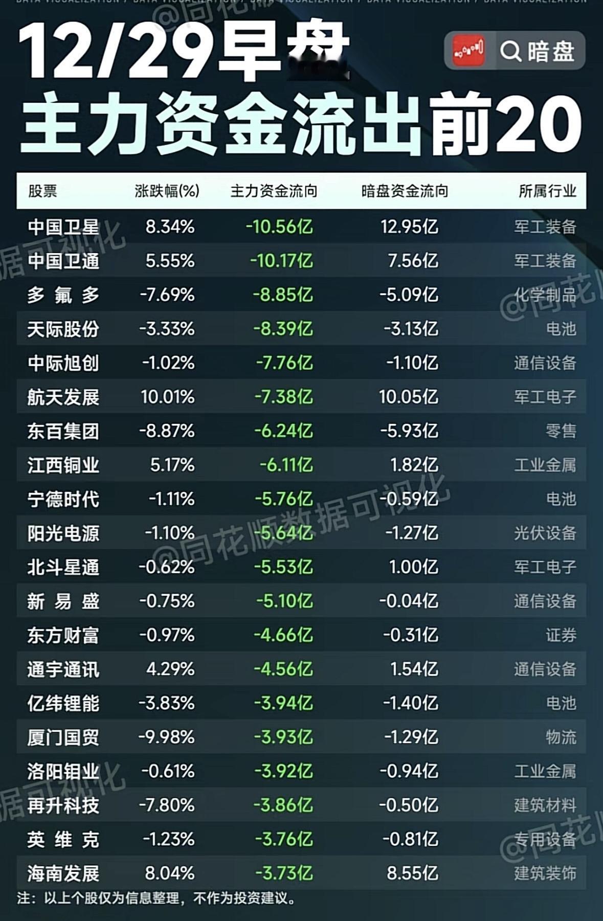 12/29早盘主力资金流出前20股, 暗盘资金动向揭秘! 主力资金流入半导体