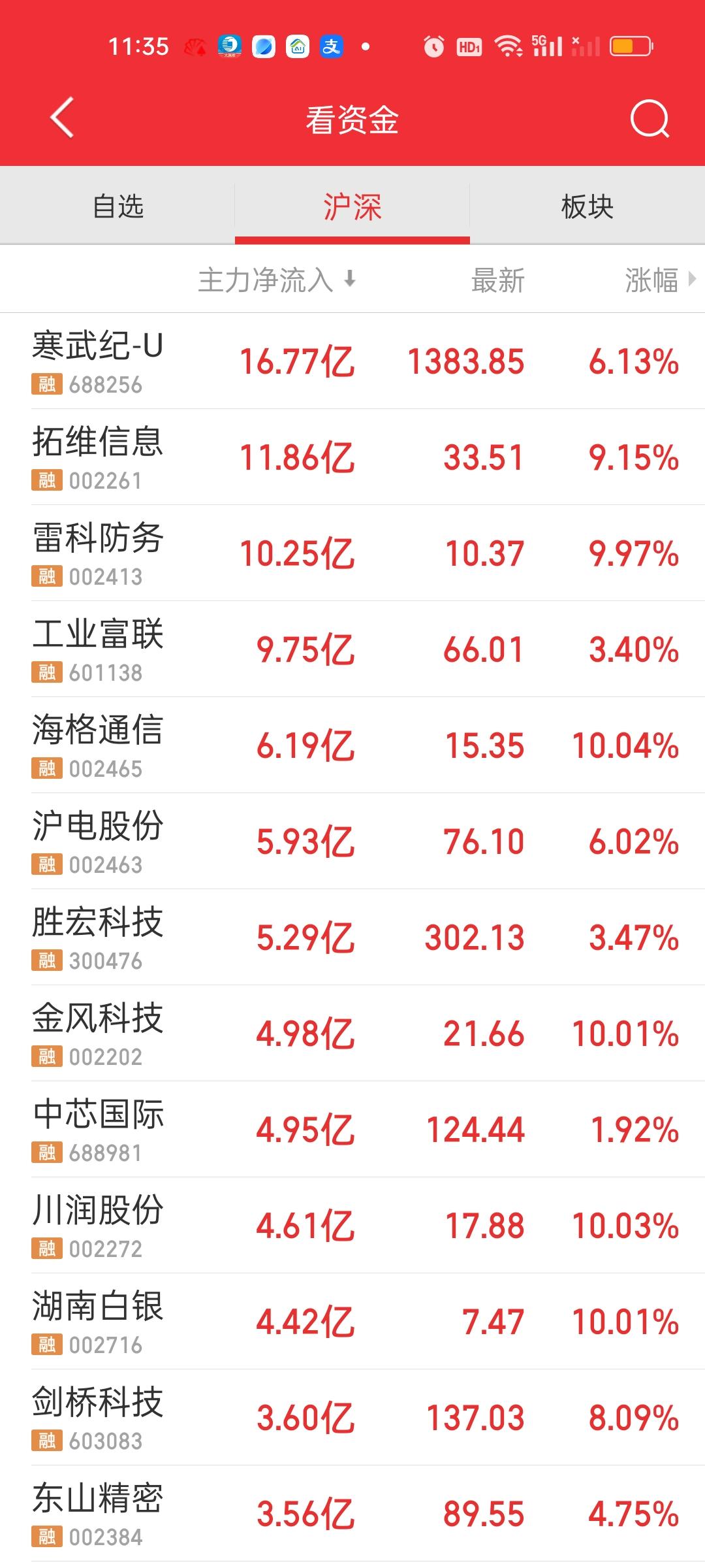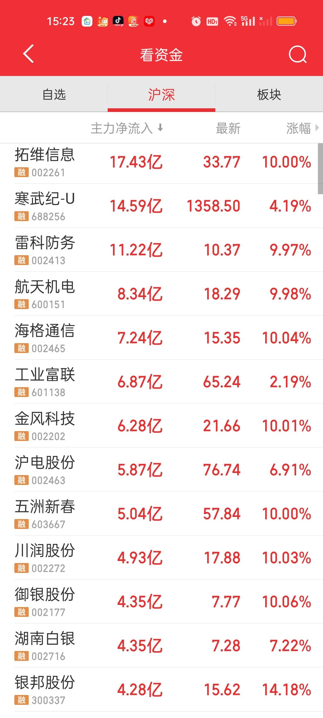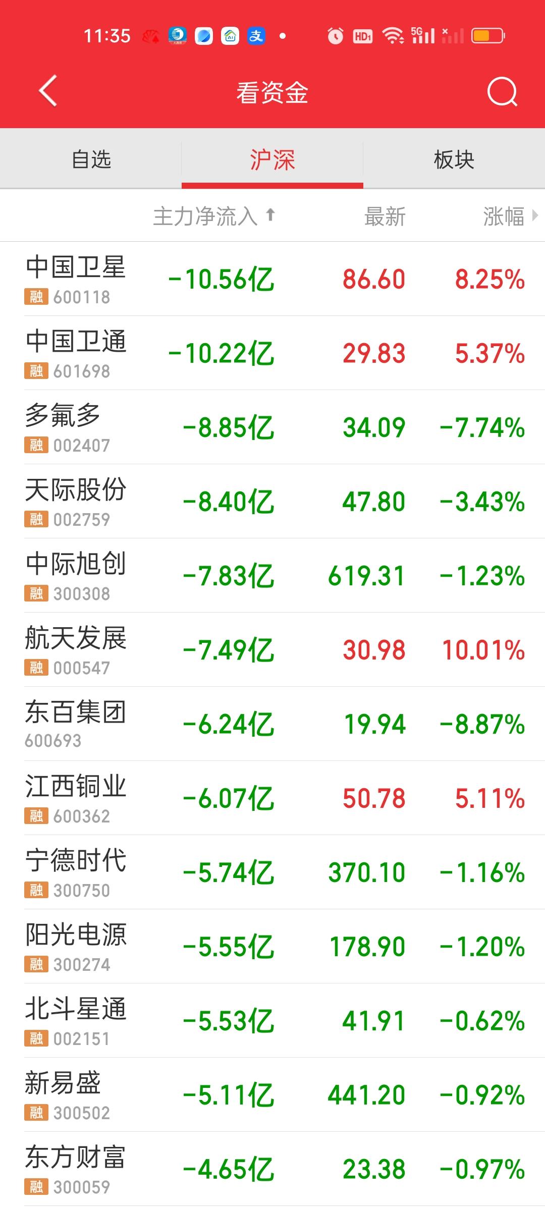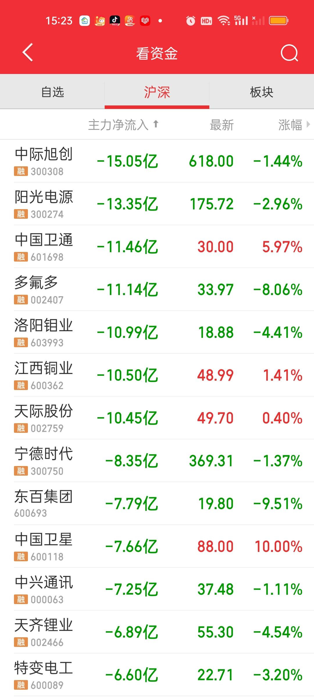 收盘了,资金在加速流出,上午净流出447.72亿,全天净流出895.66亿,895.66-447.72=447.94亿,这说明上午和下午分别流出了447亿。但下午成交量放量了578-234=344亿。 资金流入方面,拓维信息,寒武纪,雷科防务净流入资金在10亿以上,上午收盘只有中国卫星和中国卫通净流出资金在10亿以上,但下午有7只个股流出10亿以上,除了中国卫通,又有中际旭创,阳光电源,多氟多,洛阳钼业,江西铜业,天际股份这6家流出超过10亿。