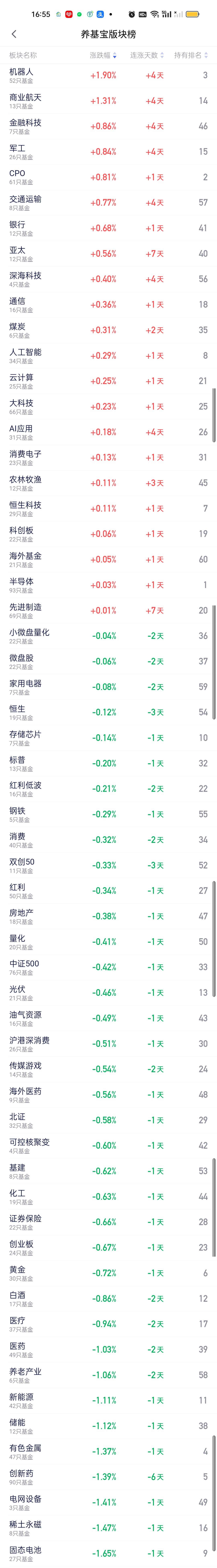 今日基金加仓榜和减仓榜已更新。国投瑞银白银期货,鹏华碳中和,汇添富中证电池是加仓榜前三,减仓榜前三是永赢先进制造,前海开源嘉鑫,东方阿尔法优选。板块涨跌方面,机器人,商业航天,金融科技,军工,CPO,交通运输涨幅居前。