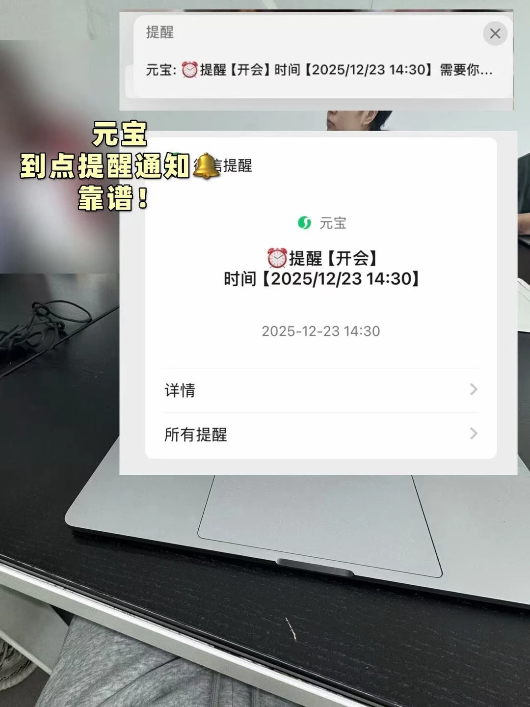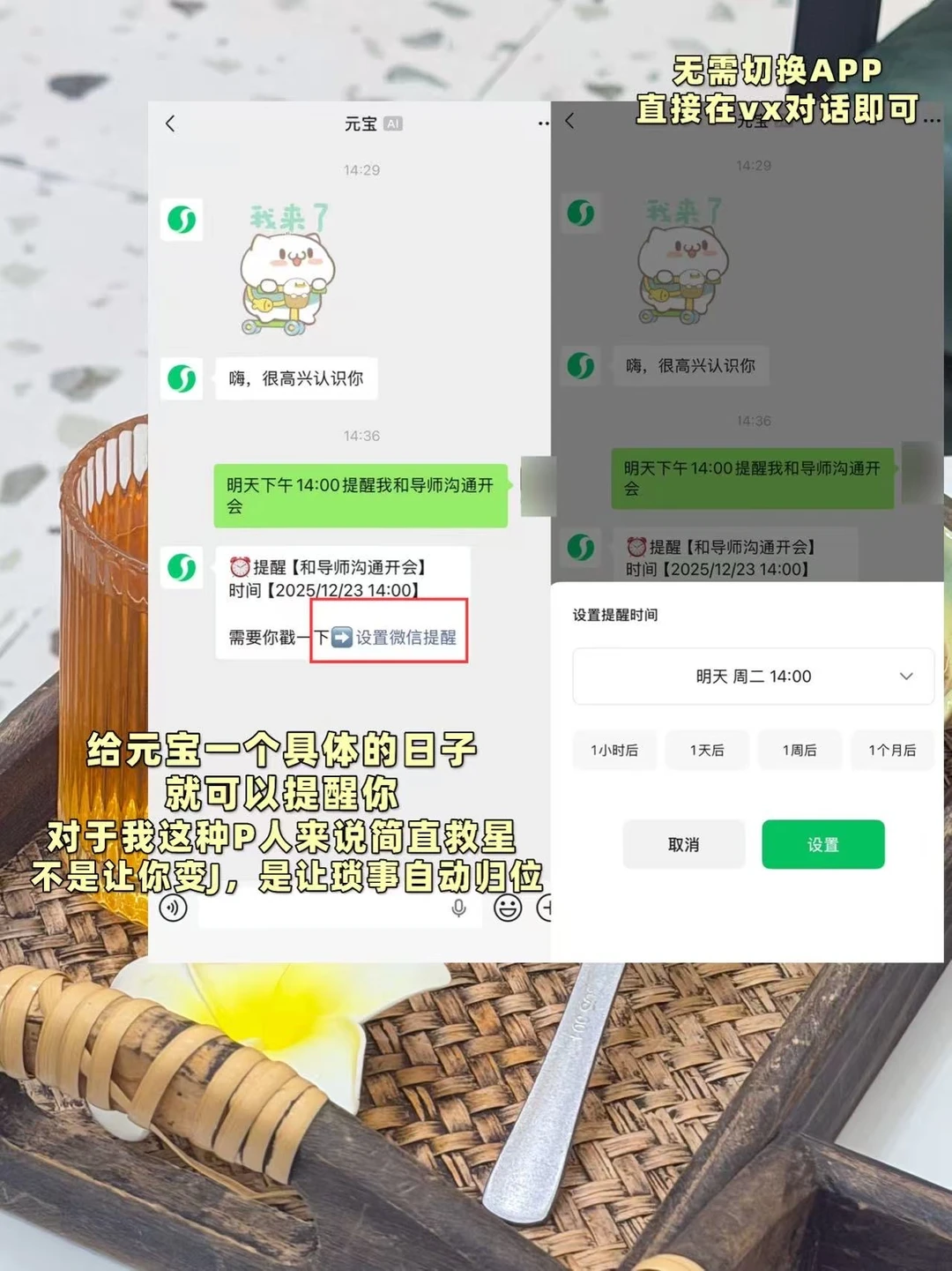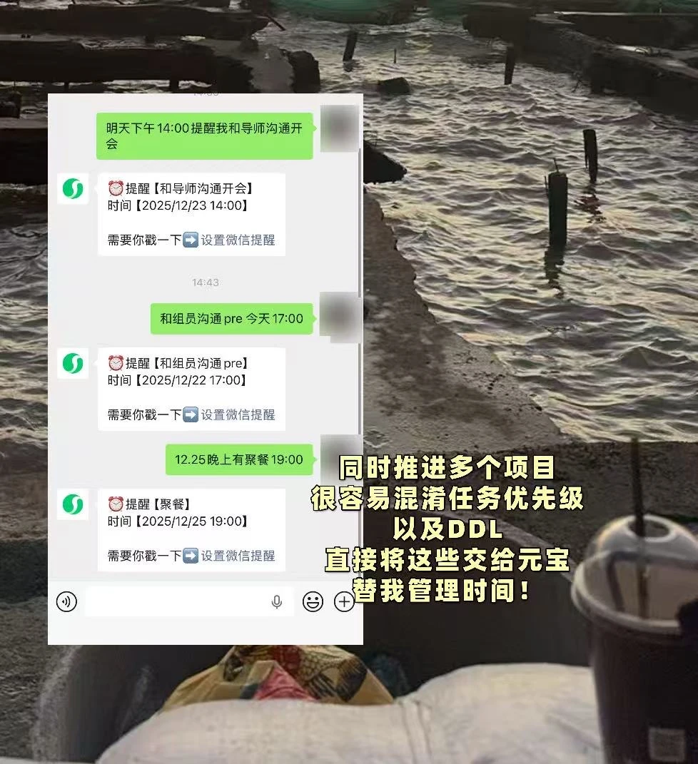 元宝会自动识别时间、任务和细节,到点元宝就会自动弹窗提醒,不用再切换 app去使用,只在微信一个软件就能满足日常所需,简直不要太爽