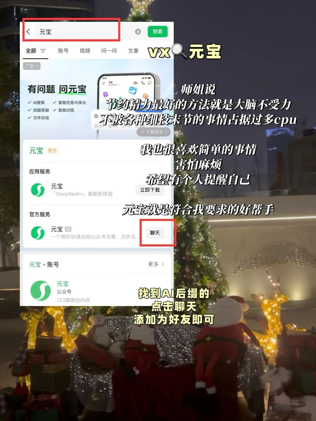 最近发现我微信里的元宝好友,它的提醒功能得真的超喜欢!操作也很简单,直接微信搜索元宝,添加AI后缀的元宝为好友就可以啦,然后随口发一句话就好: