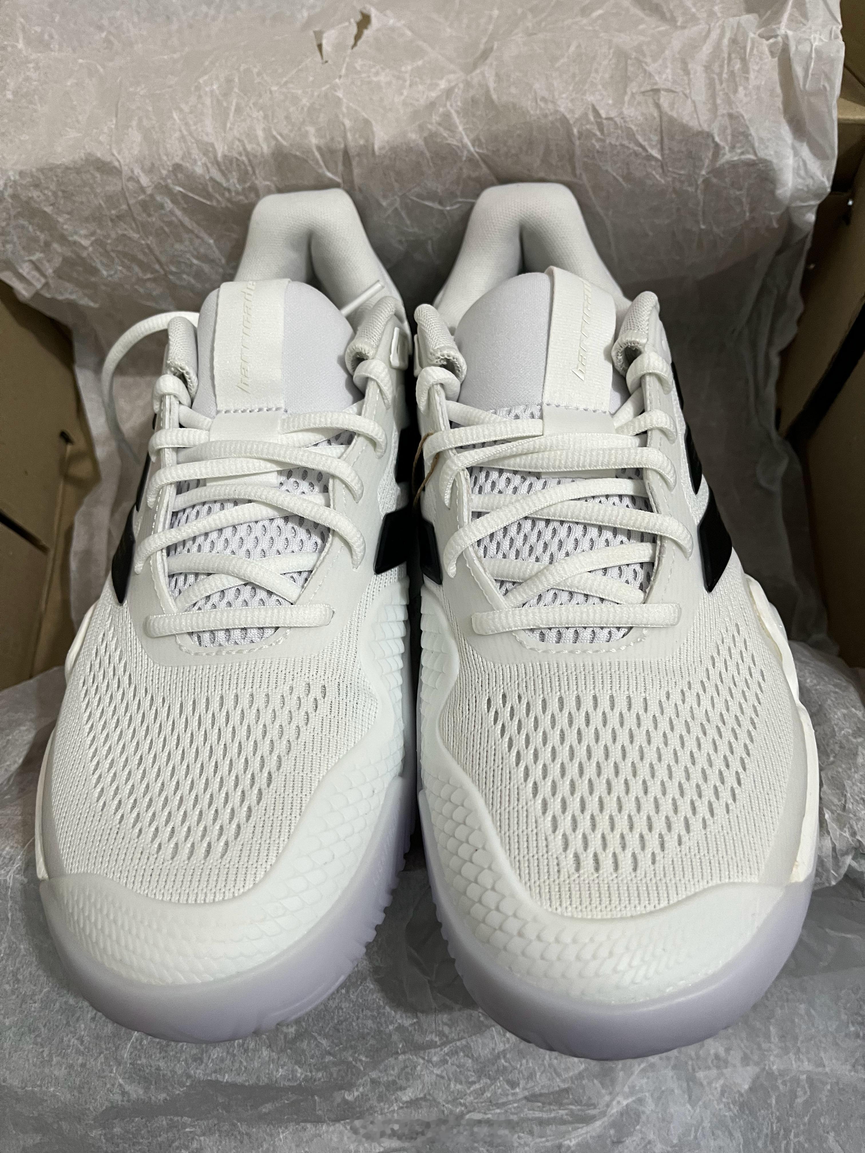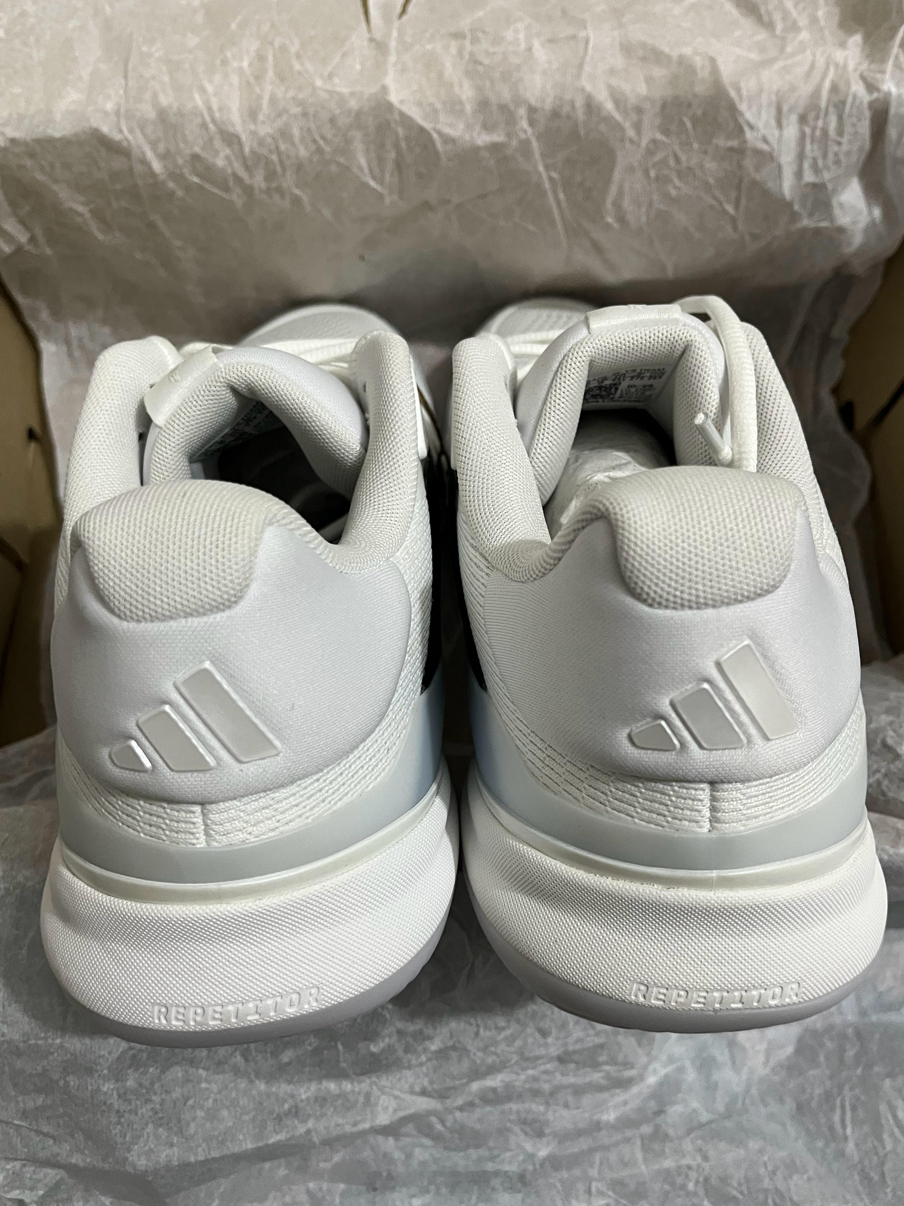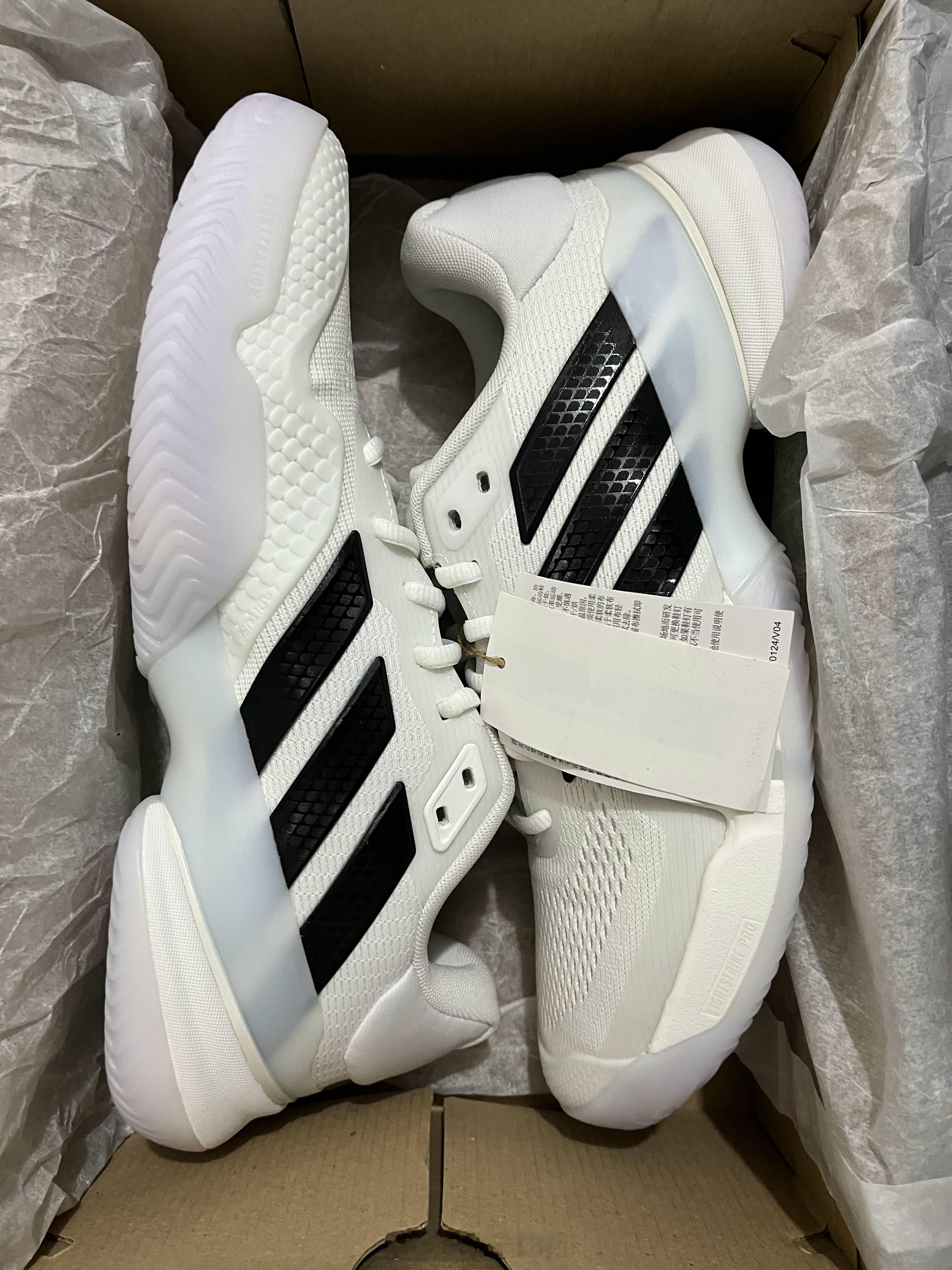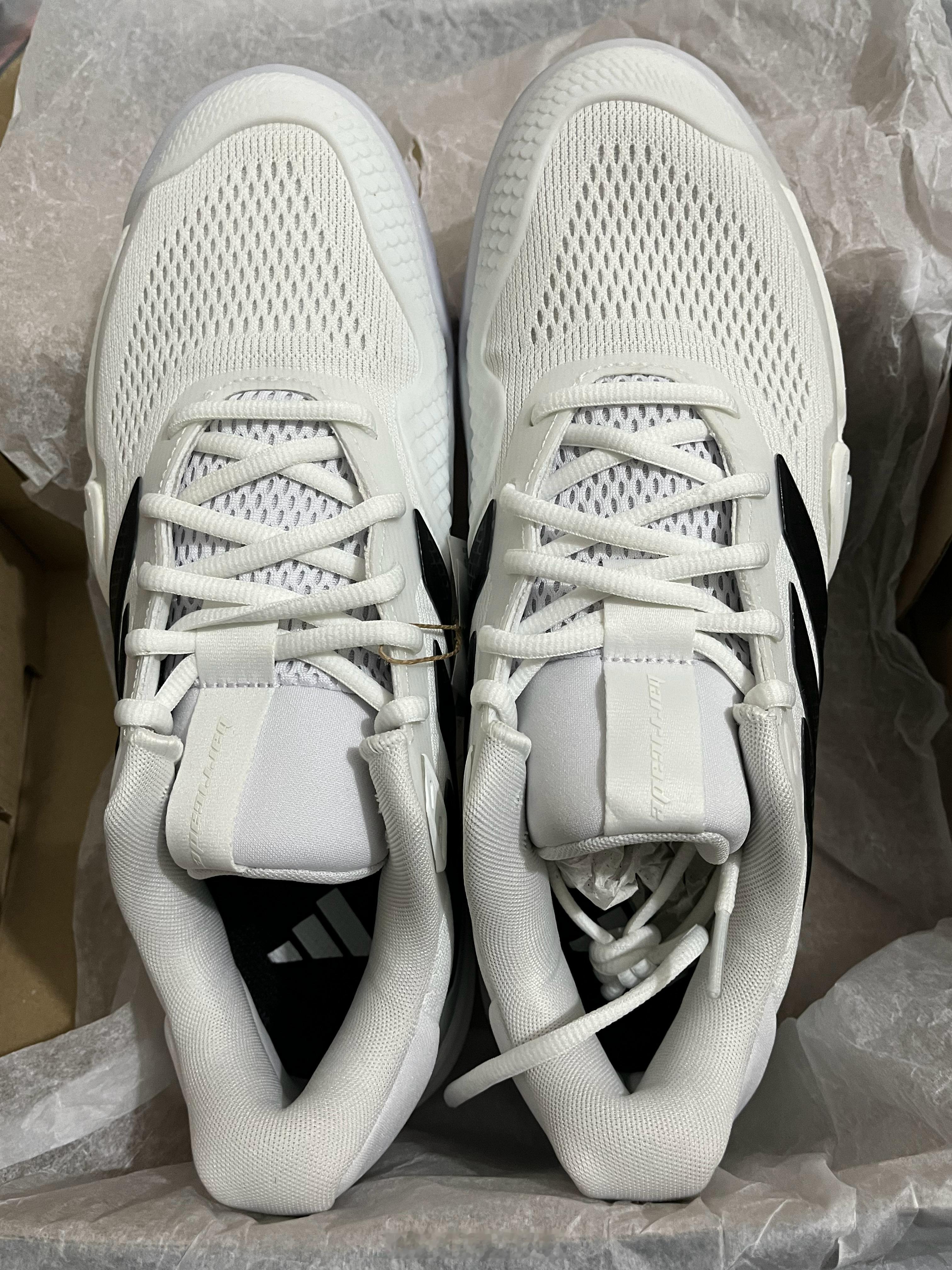 【互动有奖】收到阿迪寄来的新款Barricade 14网球鞋,开箱!!经典黑白配色不管是赛场实战还是日常训练穿搭,都百搭又耐看,完全不用纠结搭配问题。鞋子上手第一感觉就是轻,比上一代明显轻量化了不少。前掌按压下去,LIGHTSTRIKE PRO泡棉的回弹感超明显,后掌REPETITOR泡棉的减震反馈也很直观,能想象到在场上蹬地发力和急停落地时的舒适感。上脚试穿后,鞋楦优化的优势立刻体现出来,贴合脚型又不挤脚,中足支撑稳稳的,包裹感恰到好处。Adituff耐磨鞋头的几何叠鳞设计很有细节感,大底纹路清晰深邃,抓地力看着就很靠谱。还有那个爪形支撑结构,感觉能完美适配场上的横向移动和变向,准备过几天穿着它去球场实战体验一番。最后抽一位朋友发30🧧请喝杯奶茶🥤,评论即可参与~~ 抽奖详情