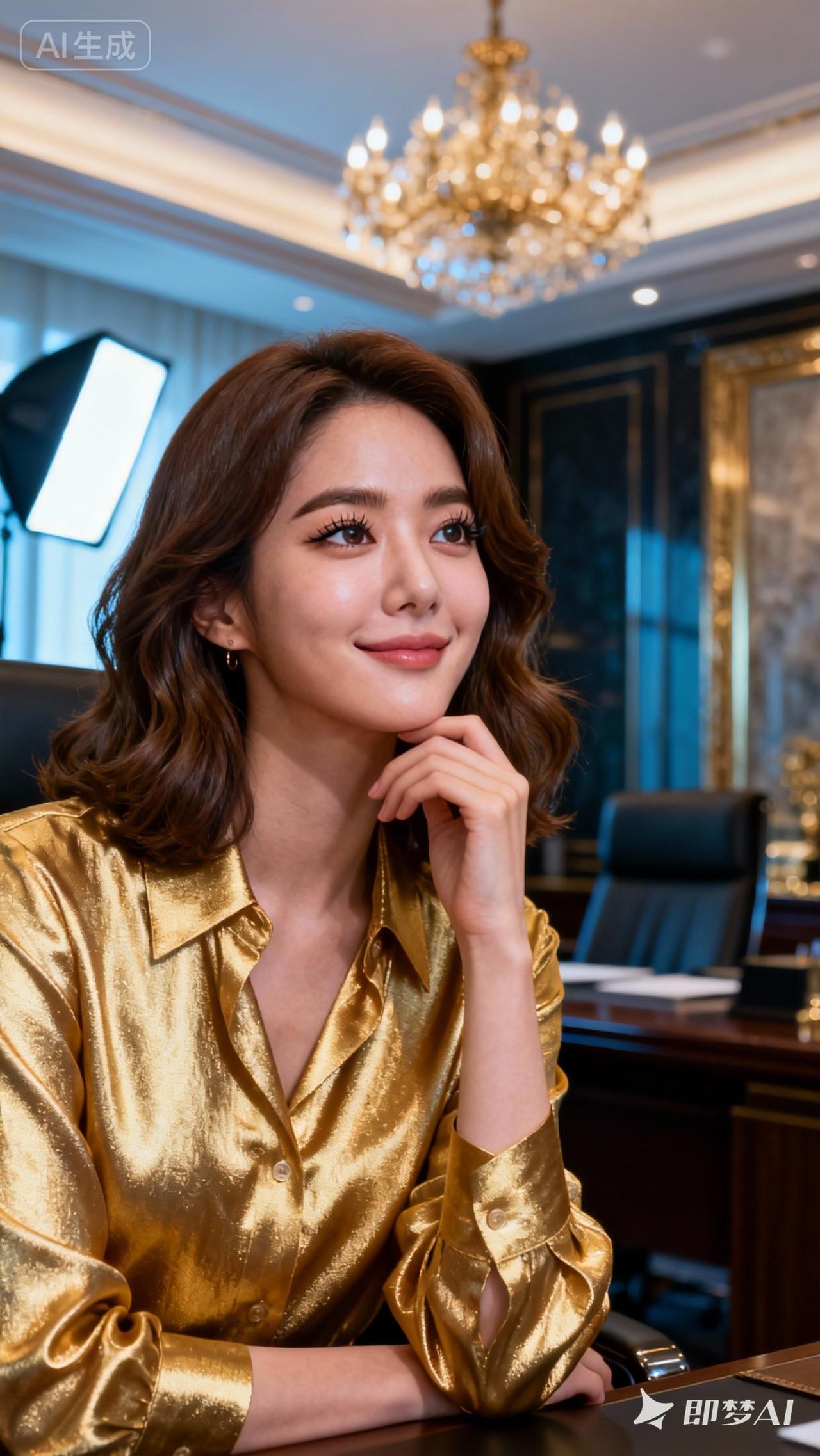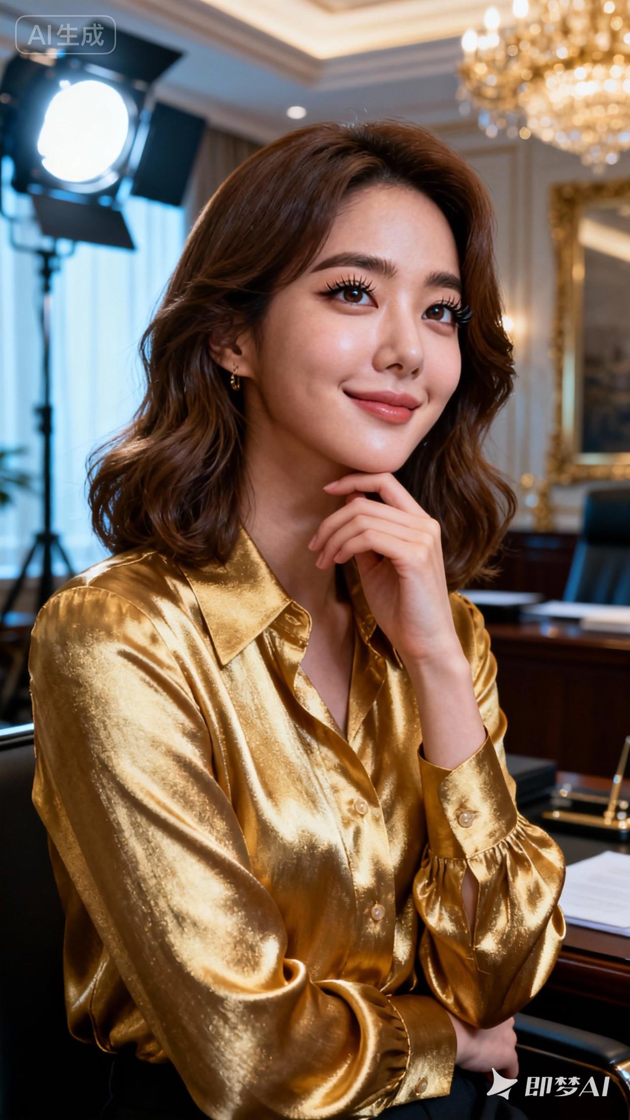 优雅金衣女郎,自信微笑,办公室里的时尚风范