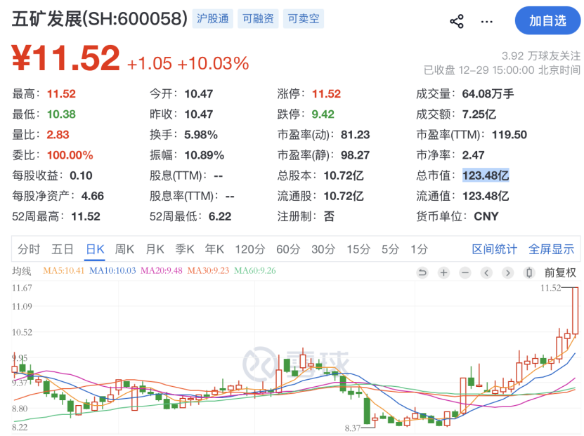 值得一提的是,12月29日开盘后,五矿发展股价大幅走强,强势封住涨停,截至收盘,涨幅达10.03%,报11.52元,成交金额达7.25亿元,较前一交易日明显放量,总市值升至123.48亿元。