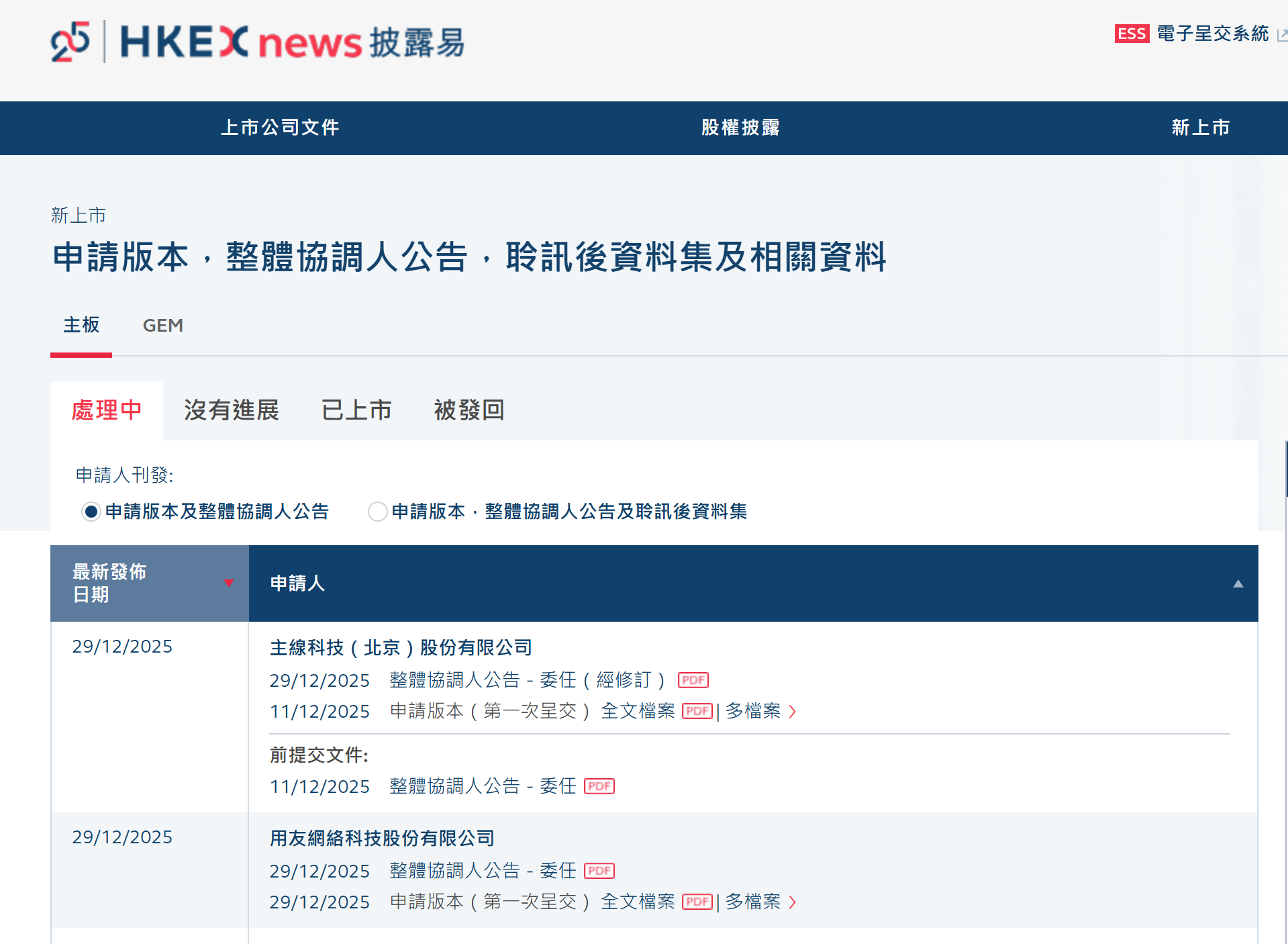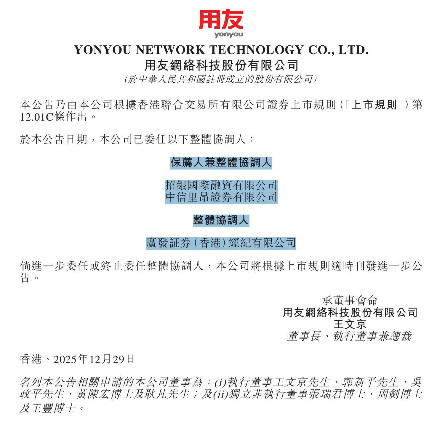 上证报中国证券网讯2025年12月29日晚,港交所披露易显示,用友网络科技股份有限公司向港交所提交上市申请书。用友网络保荐人兼整体协调人包括招银国际融资有限公司和中信里昂证券有限公司。(刘明杰)