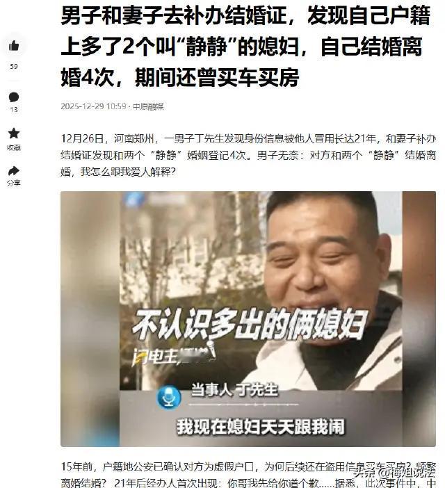 河南郑州的丁先生,普通平凡,却无意中发现了一个令人震惊的秘密——他的户籍上“竟然”多了两个名叫“静静”的“媳妇”,并且这场婚姻和离婚的大戏竟上演了4次!不仅如此,期间还名义上买了车、买了房,让丁先生哭笑不得:“这到底该怎么和真正的爱人解释?” 事情的起因看似简单:丁先生和妻子去补办结婚证,想要把婚姻情况整理得清清楚楚,却意外曝出这段“户籍闹剧”。回溯15年前,公安机关就曾确认过,这些“静静”是假户口,但这样的虚假身份居然在21年里屡屡得逞,盗用丁先生的个人信息,演绎出一幕幕荒诞的剧集。 令人震惊的是,这背后有“中间人”秦某,他是丁先生的熟人,协助对方落户,后来虽态度软化并试图私了,却被丁先生坚决拒绝。丁先生选择依法维权,坚持追究到底,不愿让违法行为轻易得逞。调查中,真相更是扑朔迷离——两个“静静”竟然是同一人通过双重户口进行身份欺诈,而更为复杂的是,她与另一男子卢某某已属夫妻关系。最终,涉嫌案件的几人相继落网,案件告一段落。 这起案子不仅让人恍若进入一场家庭伦理剧,更暴露了户籍管理和信息安全的重大漏洞。一个真实的个人信息被盗用,变成“多重身份”,甚至让家庭关系遭受无妄之灾,30多年里这样惊人的骗术竟能继续隐藏,不得不引发我们对社会诚信体系的深刻反思。 大家是否也曾担心过自己的身份信息被滥用?又有多少人意识到户籍管理背后潜藏的风险?这不仅是个人的悲剧,更是社会治理的一大考题。信息时代,保护每一个人的“实名制”权益,已经刻不容缓。 河南婚姻故事 郑州婚姻趣事