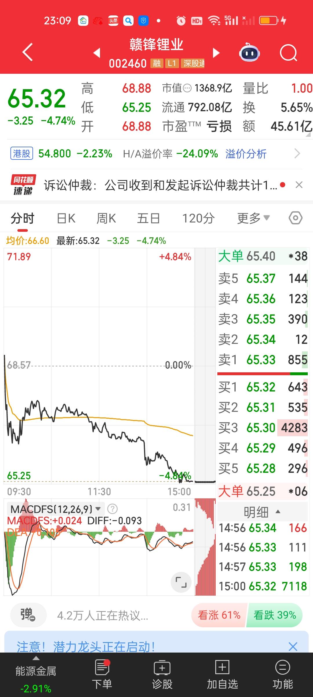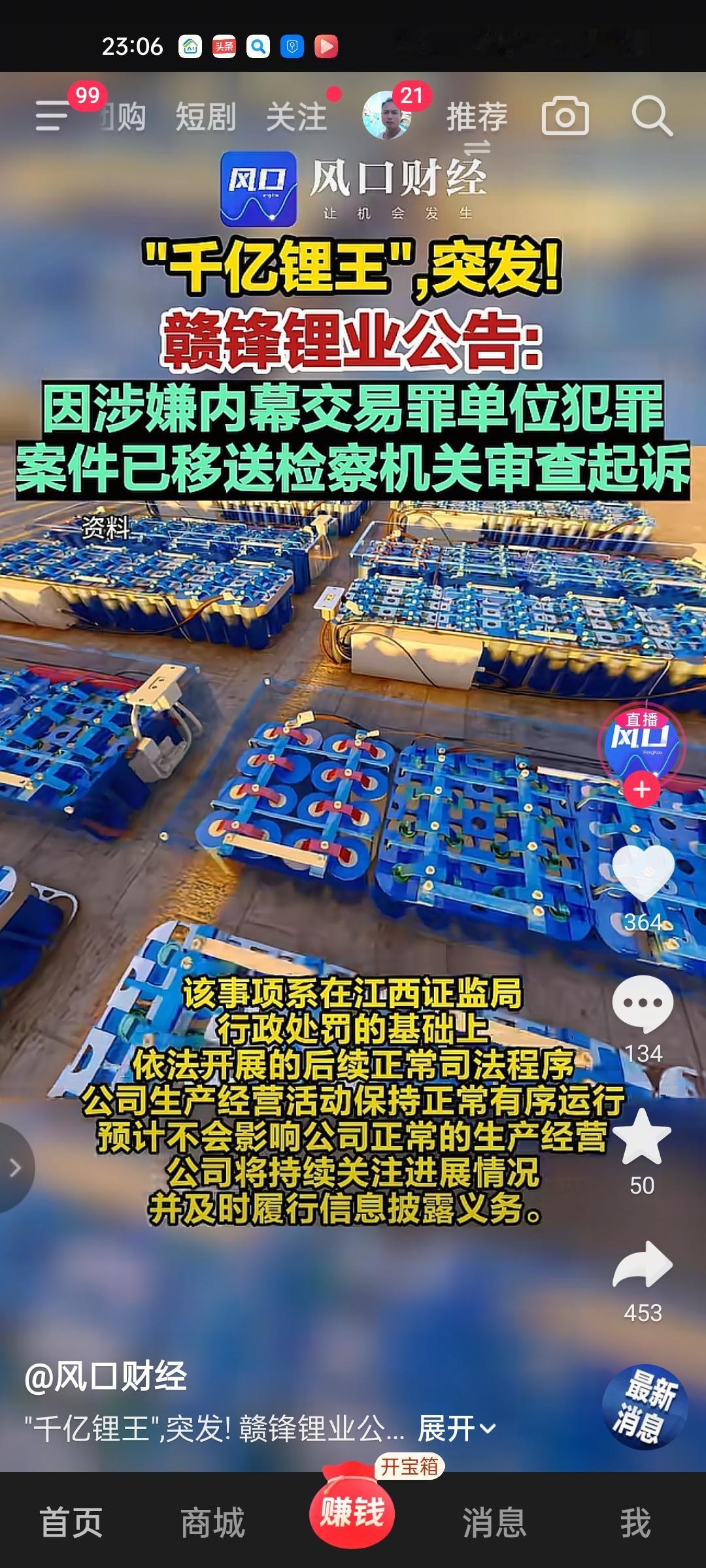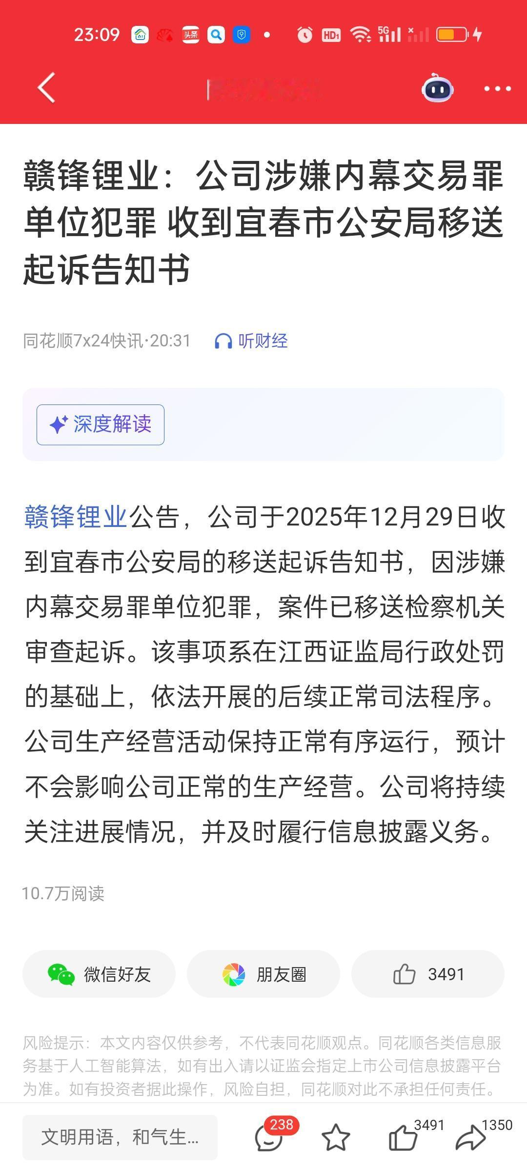 又是一枚核弹啊!就在今天赣锋锂业发布公告,公司于2025年12月29日收到宜春市公安局的移送起诉告知书,因涉嫌内幕交易罪单位犯罪,案件已移送检察机关审查起诉。该事项系在江西证监局行政处罚的基础上,依法开展的后续正常司法程序。公司生产经营活动保持正常有序运行,预计不会影响公司正常的生产经营。公司将持续关注进展情况,并及时履行信息披露义务。 这对于锂矿产业绝对是巨大的打击啊。难怪今天锂矿暴跌的。这件事情可能没有这么结束,后面可能还会有更大的连锁反应!