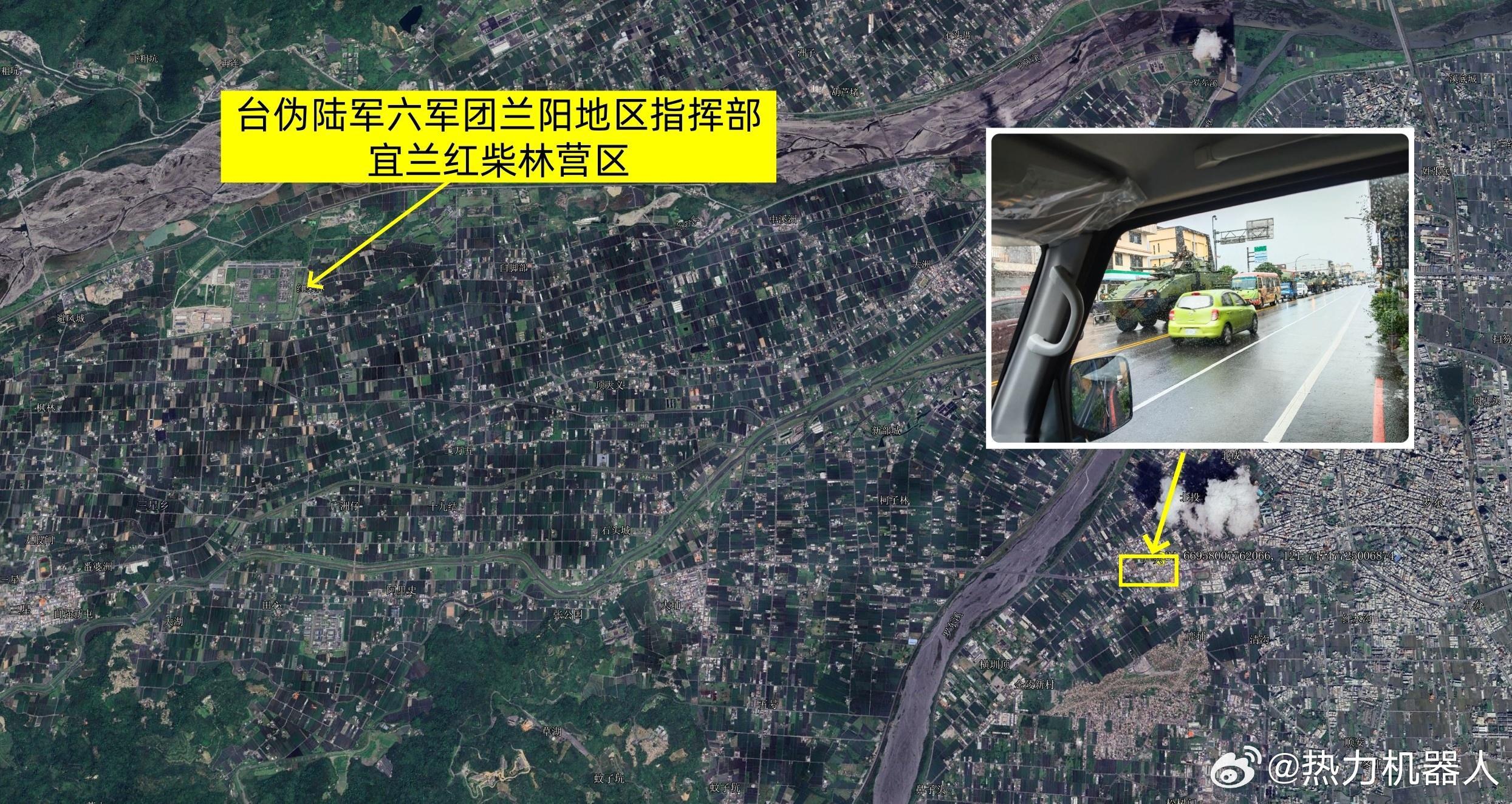 东部战区进行军事演习正义使命2025演习东部战区演习现场画面今天,我军演习后,岛内民众拍摄到台伪陆军出动云豹甲车应对(图1)根据图片,台军装甲车位于台湾省宜兰县冬山乡广兴路,由西向东行驶,(图2)为对比图。该车辆应来自部署于宜兰红柴林的台伪陆军兰阳地区指挥部机步营(图3)(图4)为谷歌给出的路线图。我军于7:30分宣布演习,台湾民众的图片显示时间为9:51分,扣除15分钟正常车程,可推算,台伪陆军兰指部应急机动力量出动装备时间约2小时左右。