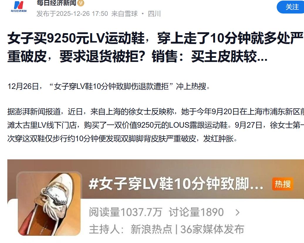 “有钱任性!”上海,女子去商场买鞋,看中了价值9250元的LV运动鞋,谁知,她穿着走了10分钟,双脚被磨得红肿破皮,伤口过了半个月还是没有愈合,女子返回店里要求退货,并赔偿。但商家只同意换货,拒绝赔偿,女子质疑买鞋的时候为啥不提醒穿袜子磨合一下?而店家的说法,让她更是傻眼了。事情到最后,双方都没谈拢。 徐女士算是LV门店的老主顾了,那天突然收到销售的微信,说有一款印着猫咪图案的露跟限定款运动鞋,全上海就这一双特意留给她,对于喜欢追潮流、爱收藏限量款的人来说,“稀缺”俩字就够有诱惑力了。 再加上官网模特光脚穿的样子随性又好看,徐女士压根没多想,立马奔去门店当场就付款把这双近万元的鞋拿下了,典型的有钱任性看中了就出手。 门店里铺着厚实的地毯,徐女士试穿时走了几步,没觉得有啥不舒服,销售人员还一个劲夸版型贴合、皮质柔软,她满心欢喜地穿着新鞋离开,目的地就在两条巷子外的美甲店,步行也就10分钟的路程,可刚走出家门没多久,脚背就传来细微的摩擦感,她以为新鞋都有磨合期,没太在意想着忍忍就过去了。 可这疼痛感压根不给她适应的时间,转眼就从轻微摩擦变成了刀割似的剧痛,每走一步都钻心,最后那10分钟的路,她是咬着牙一瘸一拐蹭到美甲店的,进店脱鞋那一刻,不光她自己,连美甲店老板都吓了一跳,双脚脚背又红又肿,还布满了七八道血口子,渗出的血把浅色袜子都黏在了皮肤上,揭袜子时的疼更是让人难以忍受。 本以为简单处理下就能好,没成想这伤口格外顽固。美甲店老板当即用碘伏帮她消毒,可接下来的半个月里,伤口不仅没愈合,还慢慢发黑结痂,稍微走路用力点,痂就会崩裂渗出血水。 那段时间徐女士只能踮着脚走路,正常生活都被打乱了,实在扛不住才去了医院,辗转两家顶尖医院,得到的诊断都是多处疤痕伴色素沉着,还被告知疤痕只能靠长期治疗改善,永远消不掉。 带着诊断报告和那双“肇事鞋”,徐女士气冲冲地回到LV门店,要求退货并赔偿医药费,可当初热情推销的销售人员,态度早就变了,轻描淡写地把责任推给她,说可能是她皮肤比常人嫩才会磨破,这个说法让徐女士当场傻眼,她质疑买鞋时为啥不提醒要穿袜子磨合,销售人员却答不上来,只说自己做不了主让她等经理处理。 这一等就是一个多月,直到12月初,门店经理才给出答复,鞋子已经穿过,影响二次销售,不能退货也不赔偿,唯一让步是换一双同款新鞋。徐女士觉得特别荒谬,这双鞋把自己害得留疤又痛苦,怎么可能再要一双一模一样的。 她又打了品牌官网客服电话,客服一边承认新鞋不穿袜子易磨脚、理应提醒,一边又说没有硬性提示规定,还以线上线下售后分离为由,把问题又推回了门店。 有钱买得起近万元的鞋,却换来了双脚永久的疤痕和一次次的维权碰壁,目前徐女士已经整理好材料,向市场监督管理部门投诉,案件还在调查中。 那双9250元的LV鞋,本该是体面的象征,最后却成了烦心事的源头,双方就赔偿和退货问题始终谈不拢,再高端的品牌,也不该用“二次销售”凌驾于消费者的权益之上,这般傲慢实在让人难以接受。
