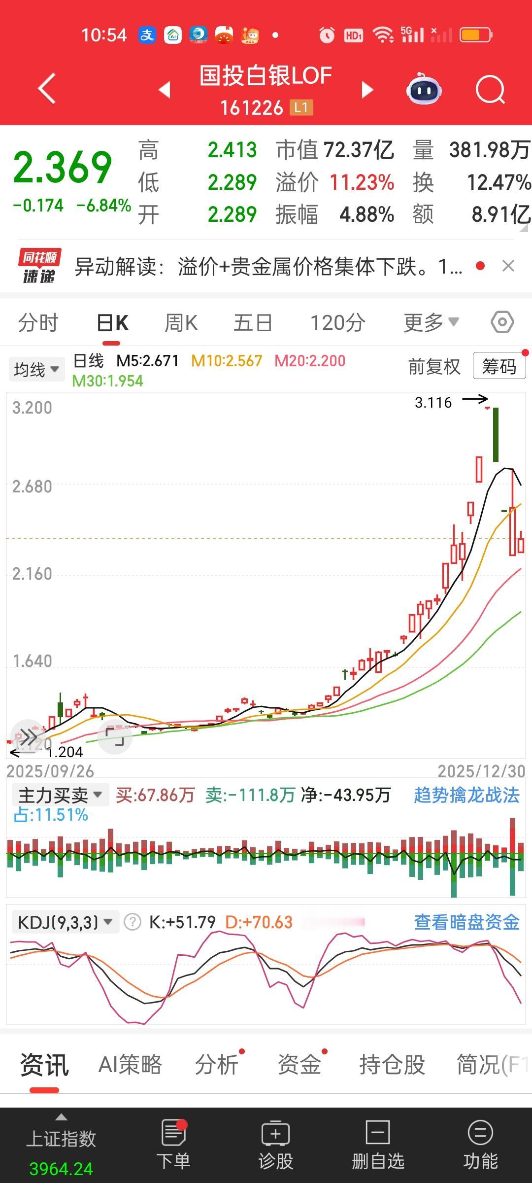 这轮白银LOF的狙杀对追高的基民来说太过残忍了!前高3.116,直接连续两个10%的跌停,昨日临时停牌,复牌以后再度跌停,尾盘收在0轴附近,然后昨晚外围突然爆杀,今天又是一个超级低开,最低点来到了2.289,也就是说只有短短4个交易日,上周四,上周五,昨天和今天。2.289/3.116=0.7345,场内基金净值直接跌了26.55%。这叫追高的人怎么活啊?