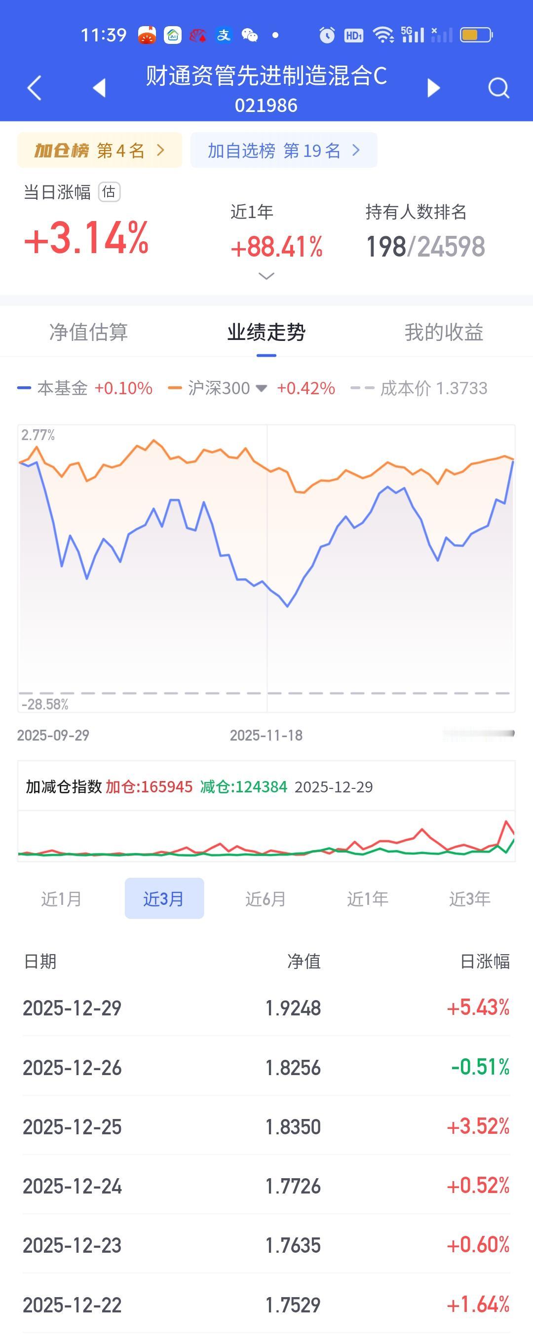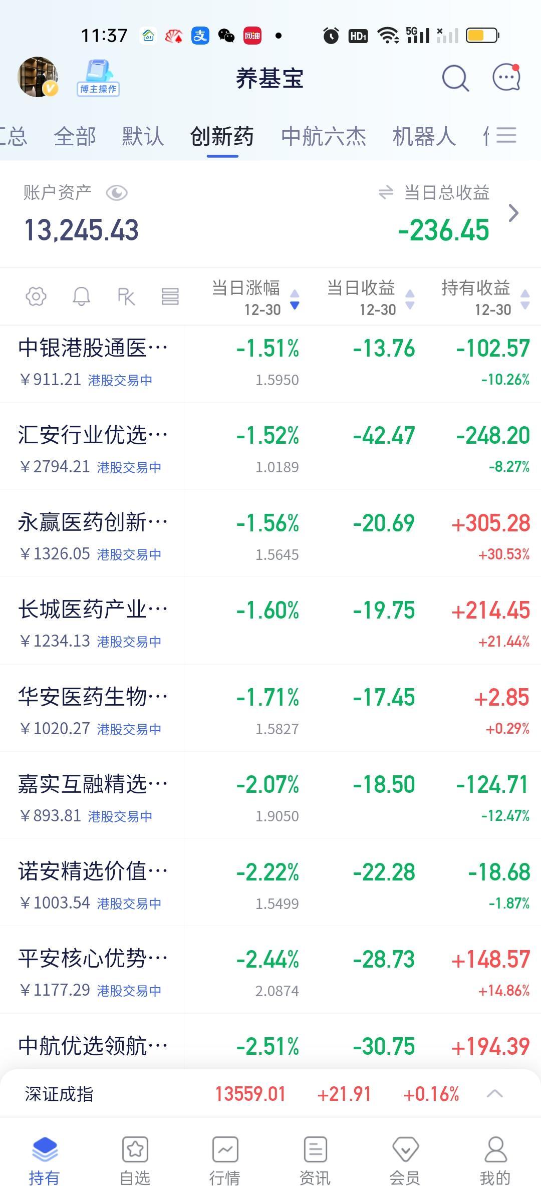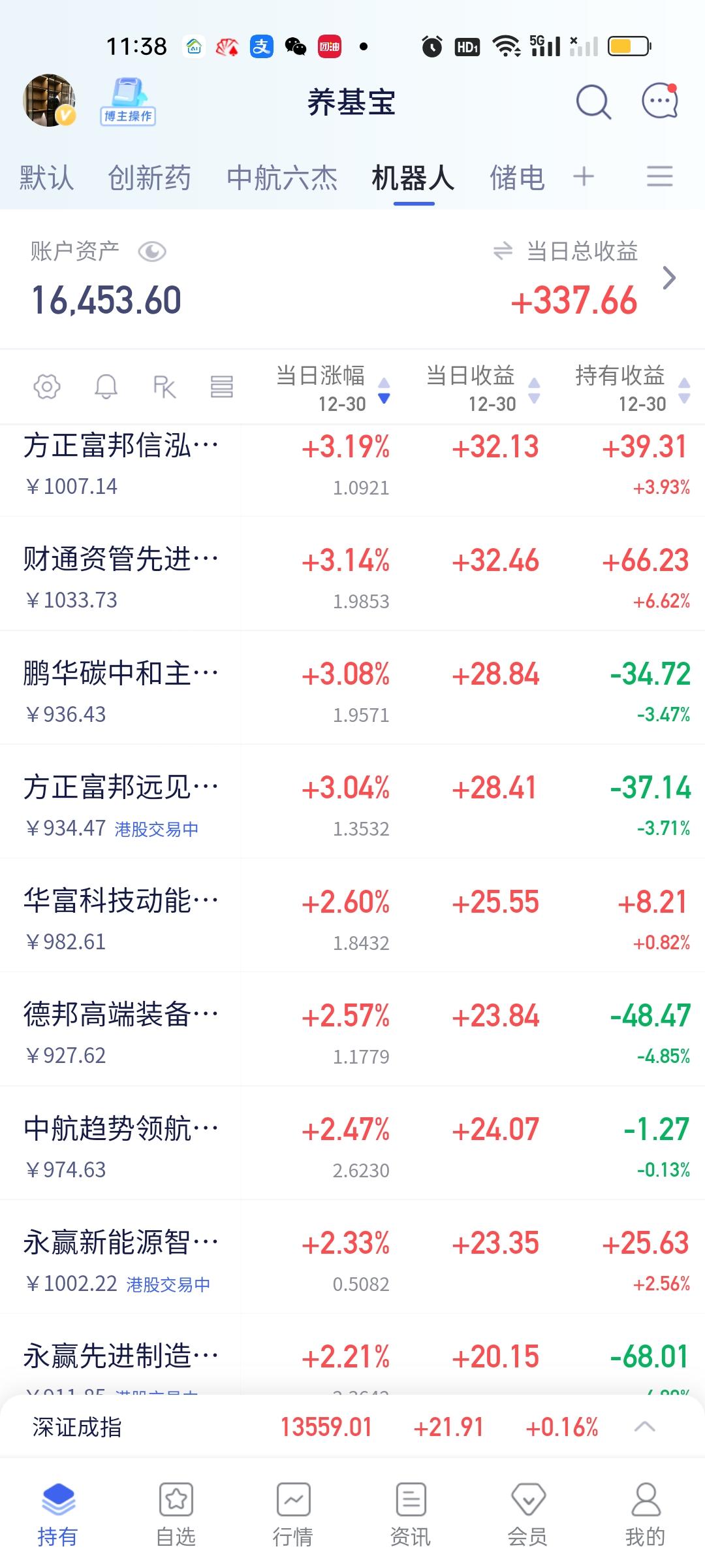 机器人今天延续了强势表现。加上今天应该说已经连续上涨7个交易日了,今天涨得依旧非常稳健。但老鼠药还是萎靡不振,漫漫阴跌长路,很难受。商业航天还在上涨,只可惜上周五就甩了。现在也只能望洋兴叹。尽管3天时间挣了17个点,但心里依旧不痛快,因为底仓买的太少了,利润没有多少,反而白白错过了大好机会,恐怕元旦之前没有接回来的机会了,明年再和大家一起玩第二波吧!