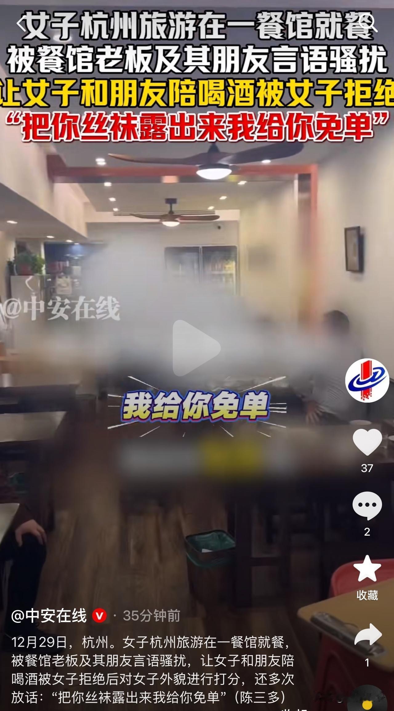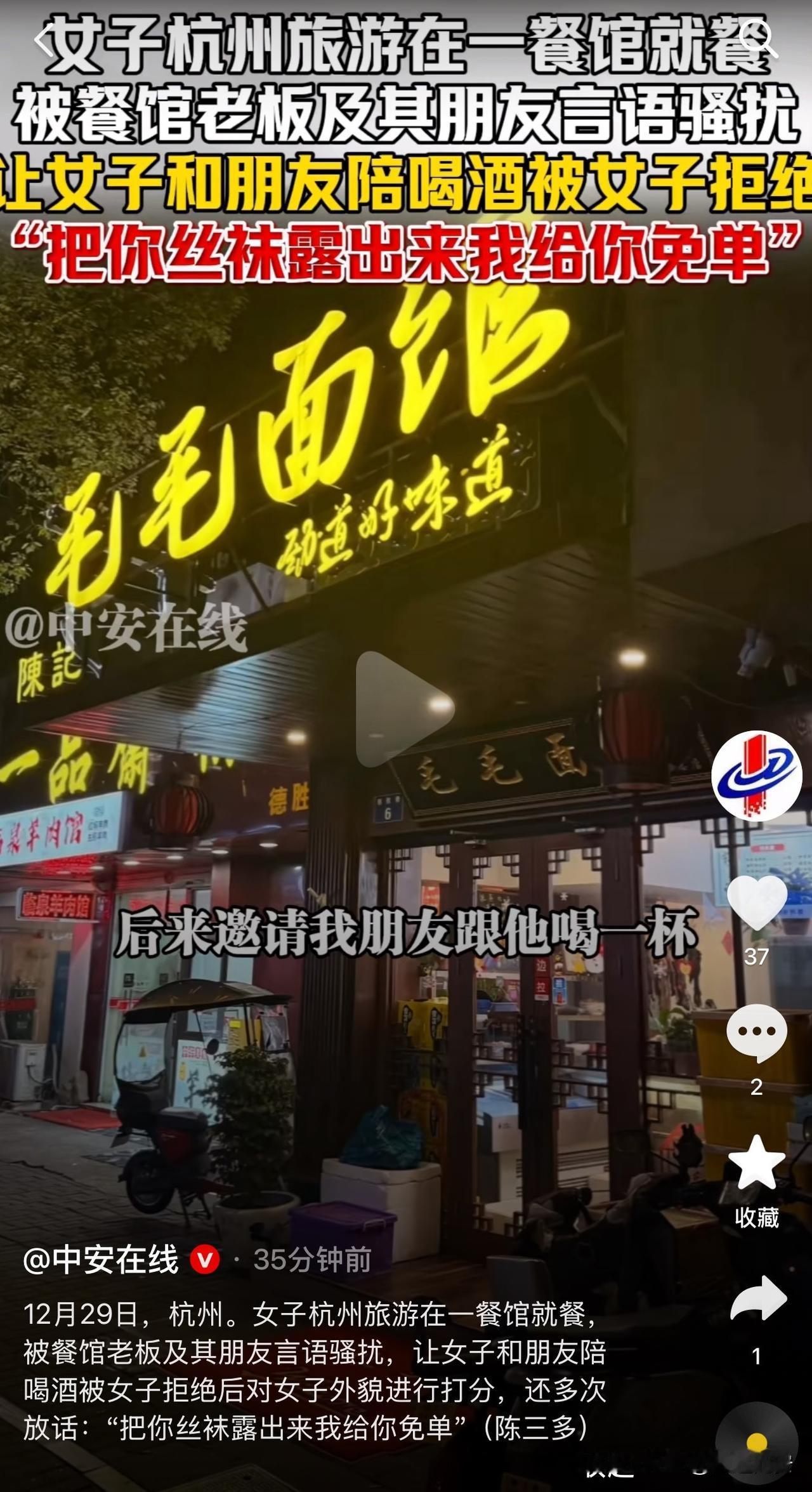 太可恶了!一女子杭州旅游到一餐馆就餐,被与餐馆老板一桌的男人言语骚扰,让女子和朋友陪酒,被女子拒绝后,还对女子外貌进行打分,甚至多次扬言,让女子露出丝袜就对其免单。 该女子和朋友一起到杭州旅游,期间到毛毛面馆就餐。 正常就餐时,餐馆老板和他的朋友一直不停的骚扰女子。开始他们让女子的朋友,跟他们喝杯酒,女子拒绝了,然后又转头让女子给他们陪酒,女子再次拒绝了。 吃了闭门羹后,他们开始对女子及其朋友,进行外貌抨击,说她们太丑,另一桌人讲她们好看,女子她们仿佛不是活生生的人,而是几件随意欣赏把玩的物件。 该女子十分生气,质问老板“你们可以这样对顾客进行评价吗?”没有得到回应。 女子这顿饭再也吃不下去,准备买单走人,没想到那帮人依旧没有放过她们。 那帮人对着女子多次放话,只要把你的丝袜露出来,给你免单。 忍无可忍的女子打开手机录视频,并且对其告知,会把他的言语行为录下来,发到社交平台,对方不假思索的说“好”。 目前,该女子已经报警,称虽然会花费时间金钱精力,但是希望每个人一点点的小努力,可以让以后少发生这种事情,让他们知道有些话有些事不要随便说,要付出代价。 此事发布到网络上,网友纷纷艾特杭州文旅,要求清理蛀虫。 这起事件实在令人愤慨!餐馆本应是顾客安心就餐之地,老板的朋友却对女子言语骚扰、外貌贬低,还提出露丝袜免单的无理要求,完全不尊重他人,但是老板没有制止,就是在放纵。 女子勇敢拒绝并报警,这种维权意识值得称赞。希望法律能严惩此类不当行为,让社会少些这类无礼之徒,多些对他人基本的尊重与包容。