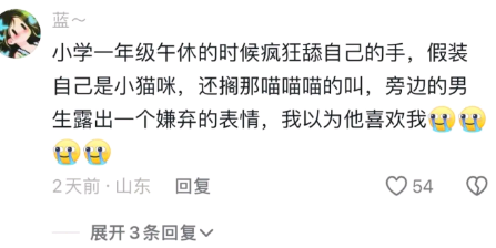 小学一年级午休的时候疯狂舔自己的手,假装自己是小猫咪,还搁那喵喵喵的叫,旁边的男生露出一个嫌弃的表情,我以为他喜欢我