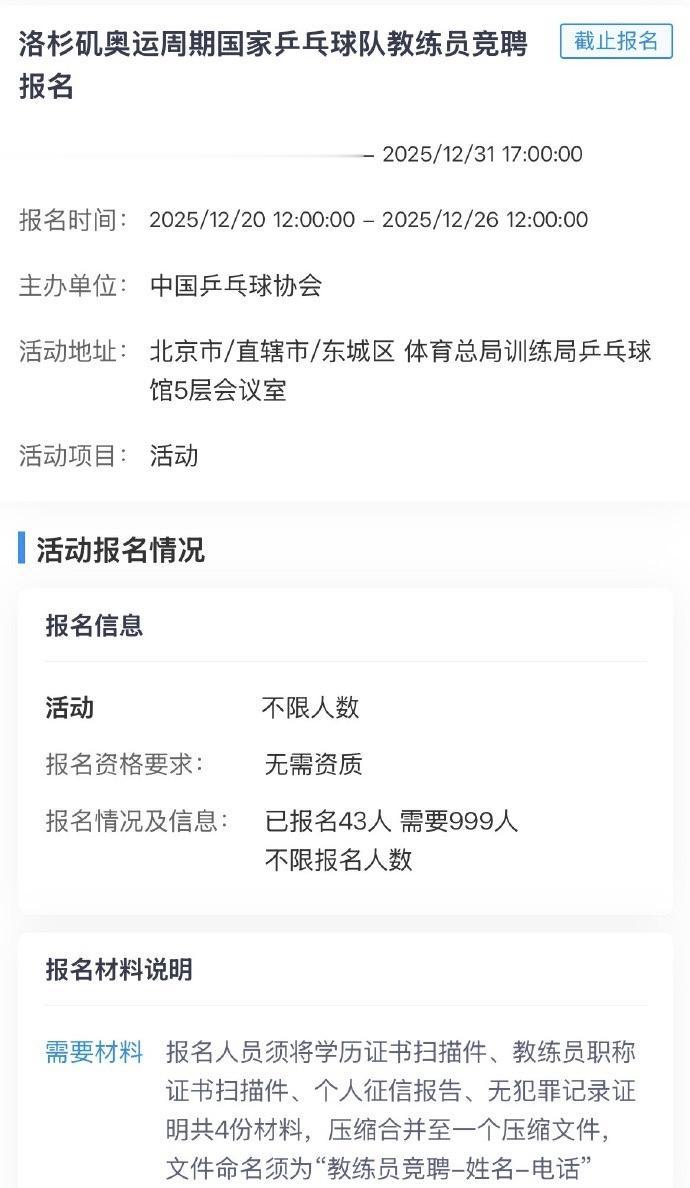 虎扑12月30日讯洛杉矶奥运周期国家乒乓球队教练员竞聘报名已于2025年12月26日截止,共43人报名,将最终选出28个教练岗位。