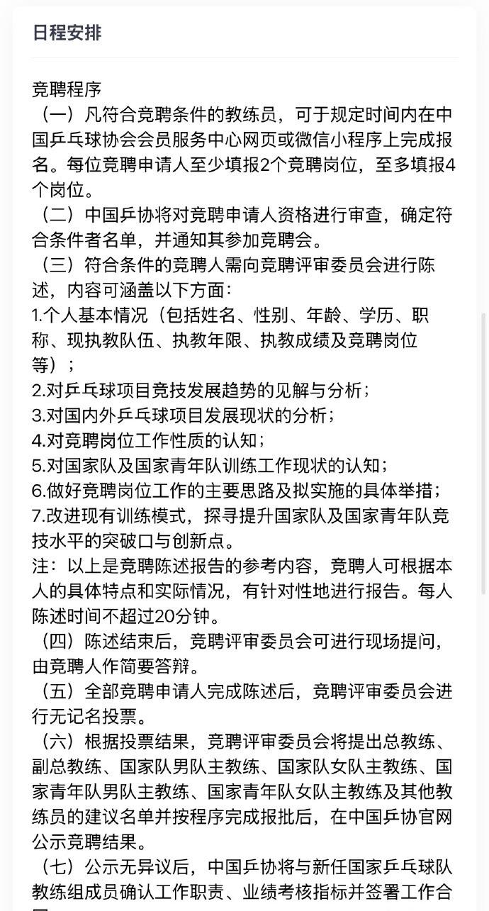 竞聘评审由乒协领导、专家、科研人员及优秀运动员代表组成委员会,通过陈述、答辩与无记名投票决定人选。