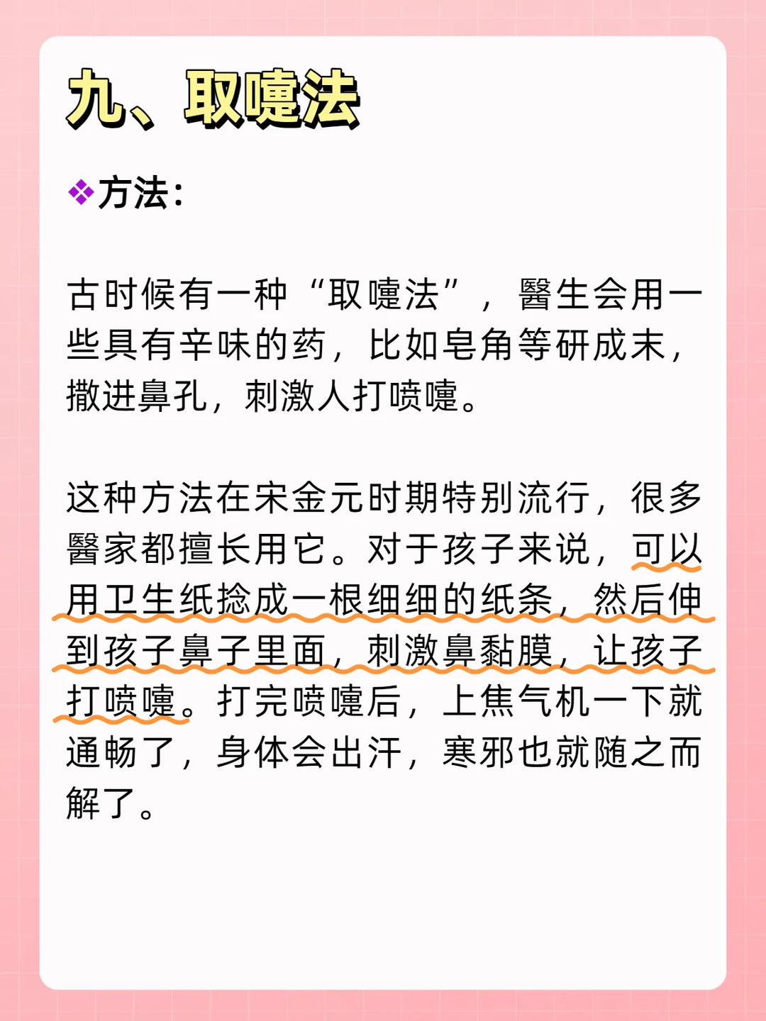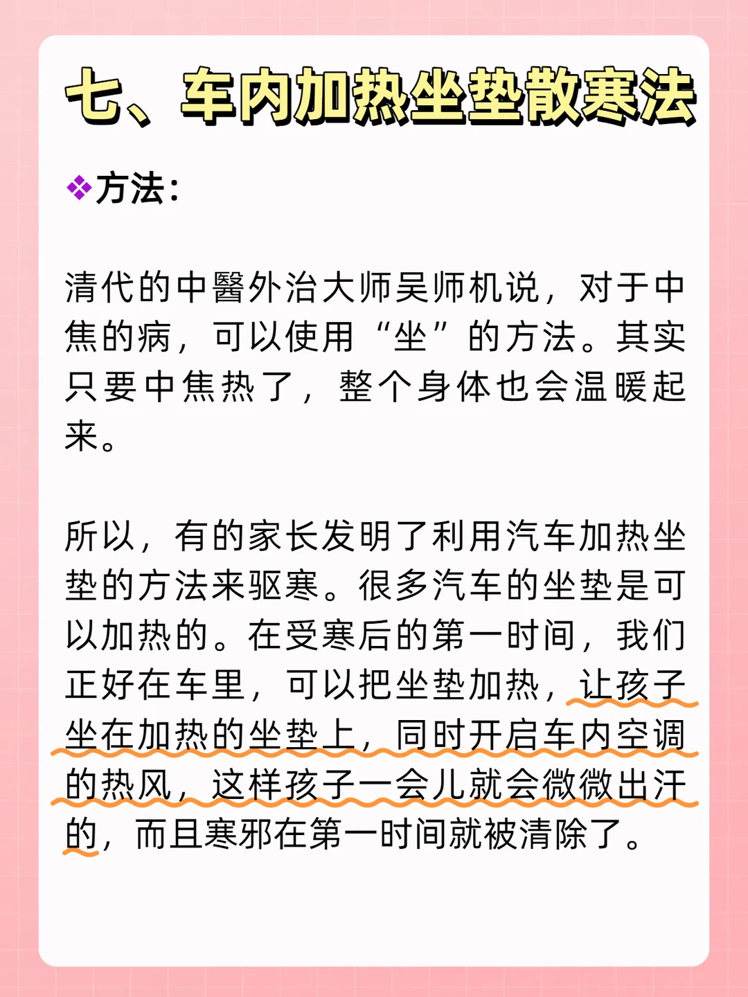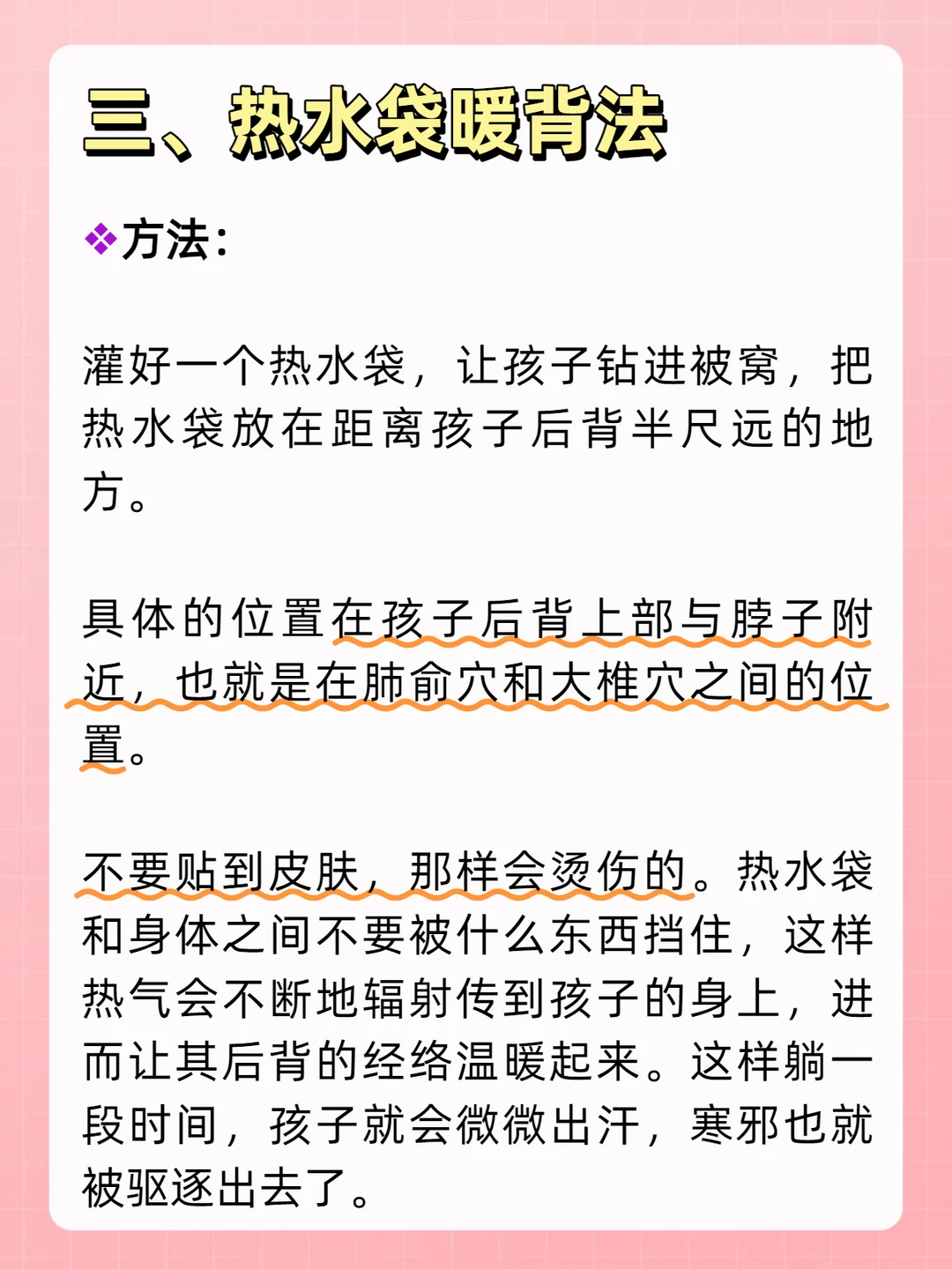 灌好一个热水袋,让孩子钻进被窝,把热水袋放在距离孩子后背半尺远的地方,具体的位置在孩子后背上部与脖子附近,也就是在肺俞穴和大椎穴之间的位置。不要贴到皮肤,那样会烫伤的。热水袋和身体之间不要被什么东西挡住,这样热气会经过不断的辐射传到孩子的身上,进而让其后背的经络温暖起来。这样躺一段时间,孩子就会微微出汗,寒邪也就被驱逐出去了。