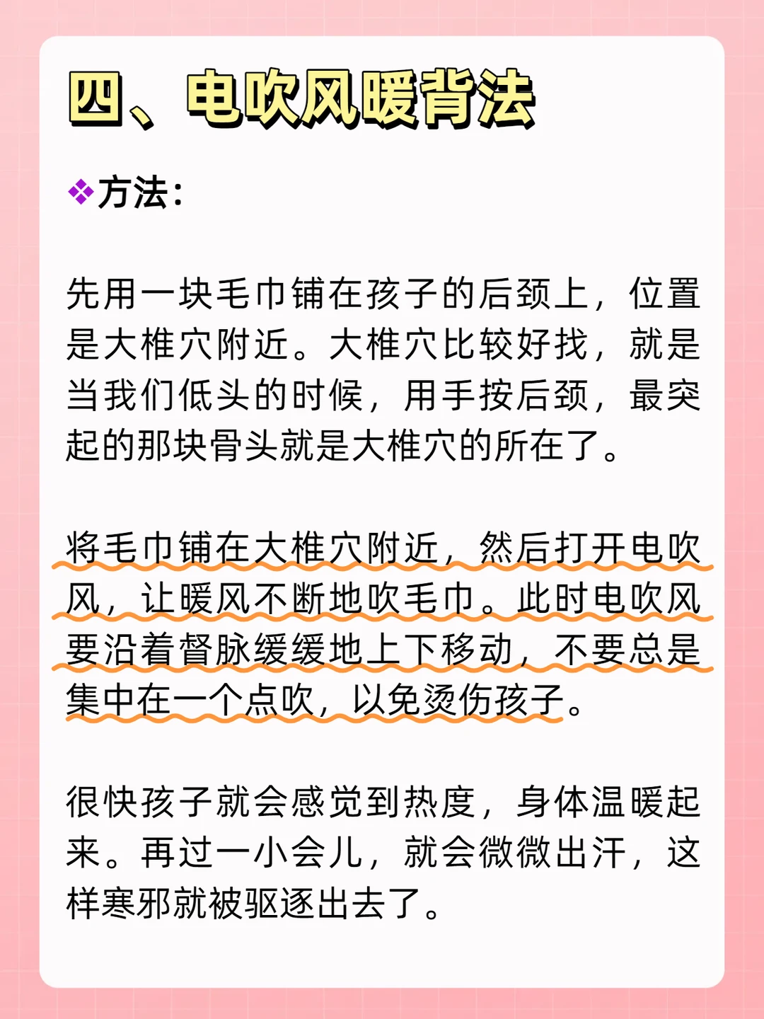 将毛巾铺在大椎穴附近,然后打开电吹风,让暖风不断地吹毛巾。此时电吹风要沿着督脉缓缓地上下移动,不要总是集中在一个点吹,以免烫伤孩子。很快孩子就会感觉到热度,身体温暖起来。再过一小会儿,就会微微出汗,这样寒邪就被驱逐出去了。