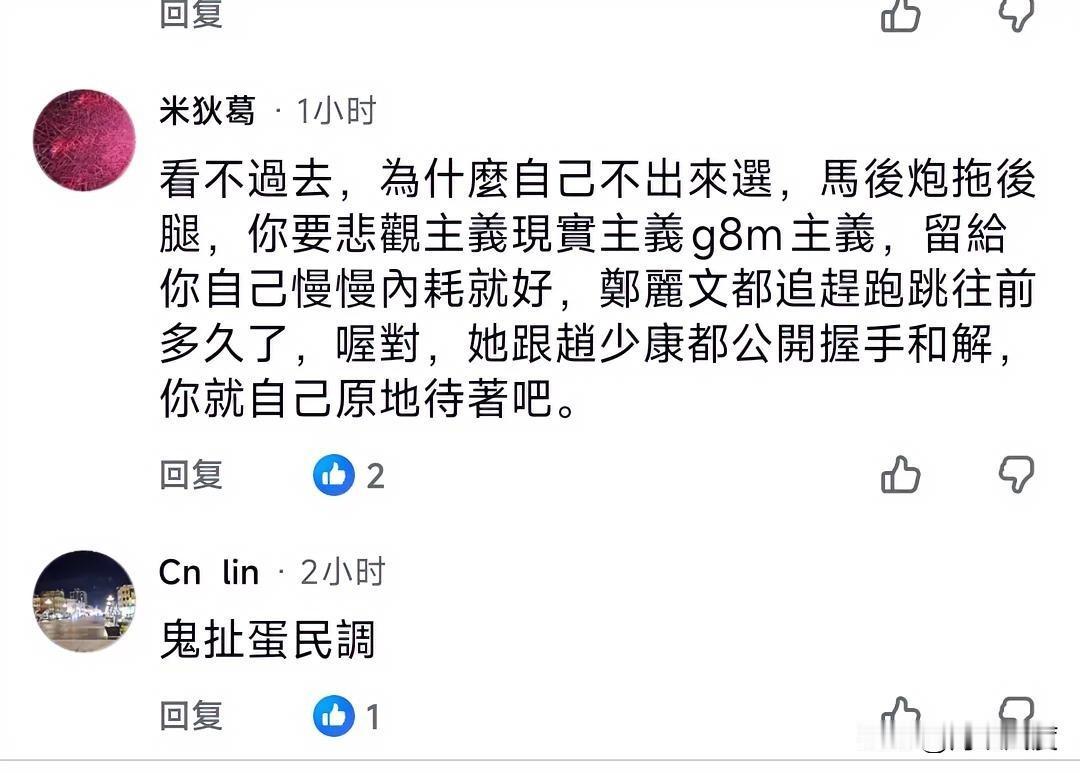 郑丽文握手赵少康,蔡正元脸书又阴损郑丽文!蔡正元到底与郑丽文有啥仇啥怨?网友留言:就是支持郑主席信任郑主席! 蔡正元30日晚间在脸书阴阳怪气的发了一段莫名其妙的话:“韦安观点:国民党支持度会崩跌,一点都不奇怪。”后面附了一篇评论的链接。 就这么一段话,但是却配上了郑丽文的一张图片。很明显,蔡正元这是借用不知是哪位的韦安的观点来唱衰国民党,而配上郑丽文的图,就是指槡骂槐,贬损是郑丽文惹得国民党支持度崩跌。 蔡正元这么阴损的事也干得出来?唱衰国民党,配上郑丽文的图,影影绰绰,鬼鬼祟祟,令人鄙夷!难道是日前郑丽文与赵少康相逢一笑泯恩仇,刺激到了蔡正元? 不知道蔡正元根据哪份民调得出国民党支持度崩跌?还是前段时间的游盈隆的民调?还是震传媒一众绿蛙的民调?打开链接一瞧,果不其然,原来这个叫韦安的人引用的就是游盈隆被赖清德提名后,为赖清德交上的一份投名状而释放的民调。这份民调,游盈隆一口气为民进党增加7.3个百分点,国民党下滑到20.6%。 就这个烂民调,连郭正亮都耻笑游盈隆这是求官送大礼的假民调。蔡正元还一本正经的拿来引用,关键他拿引用的目的,是配上郑丽文图片,是不是有点卑鄙? 另外,郑丽文就任党主席,到底做出了什么让蔡正元不开心事?让蔡正元一直拧巴到现在?难道蔡正元是见不得郑丽文为两岸和平开大门,走大路吗? 不过网友并没有惯着他,评论区要么是对郑丽文赞扬,要么就是对蔡正元的批评。 网友纷纷留言支持郑丽文,“欣赏郑主席”、“就是支持郑主席,信任郑主席”、“支持郑丽文”。 也有网友反问蔡正元:“韦安是个玩意吗?”、“韦安是谁啊,怎么从没听过这号人物,不会又是出来应征民进党青鸟王职位的吧。” 甚至连民众党的支持者对蔡正元黑自家党主席都看不下去了,该网友骂道,“什么烂评论!如果民众党民也有三民自的电视台、报纸天天吹,我党也会上升啊!媒体人,白 痴一堆!” 也有网友忍着性子指出,“温良恭俭让已经过去了,主动出击才是最好的防守,时间还很长 ,民调慢慢看……” 更有网友一针见血指出:“看不过去,为什么自己不出来选,马后炮拖后腿,留给你自己慢慢内耗就好。郑丽文都追赶跑跳往前多久了。喔对,她跟赵少康都公开握手和解,你就自原地待着吧!”