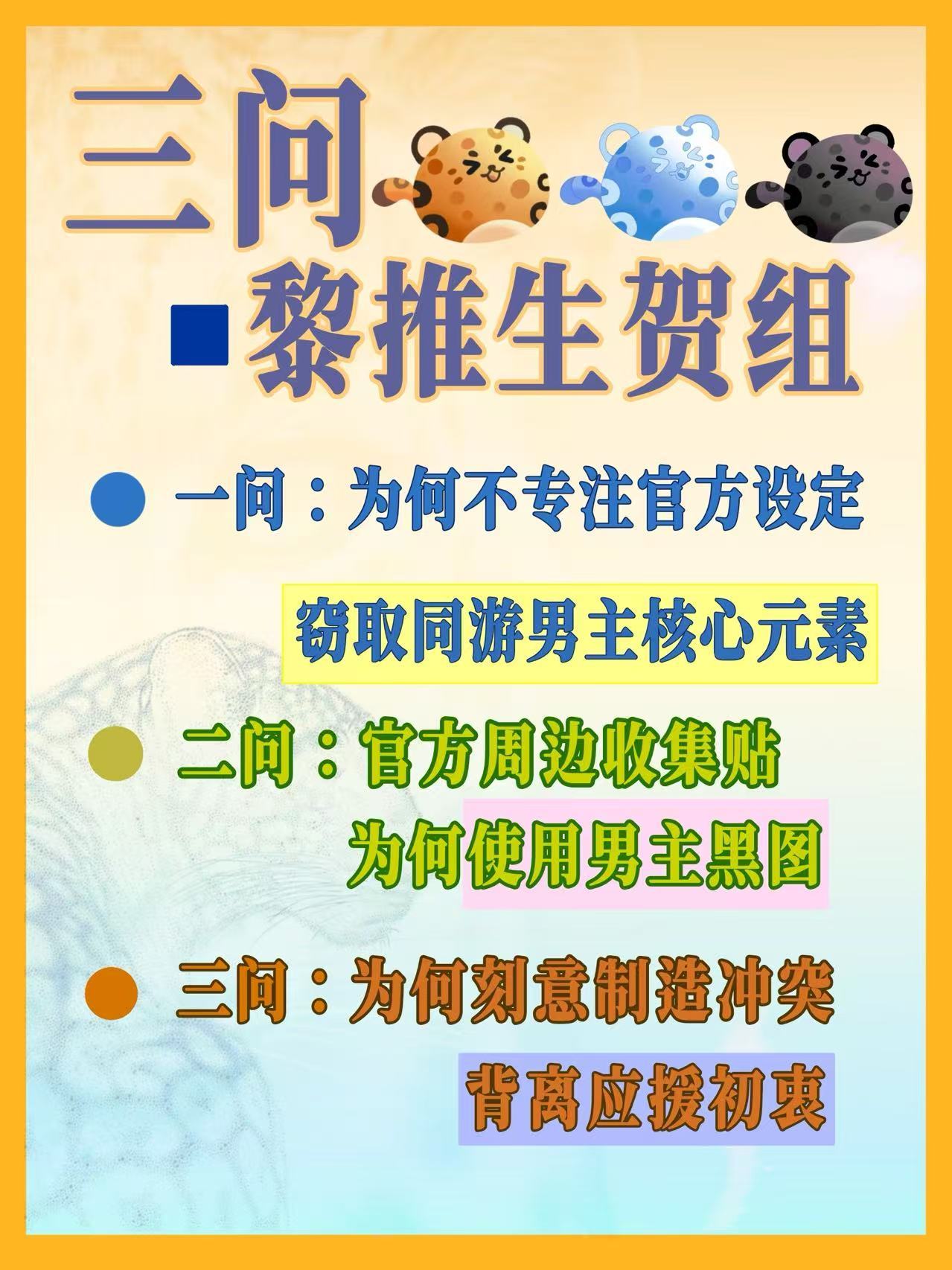 近期某推shz的险̄恶̄嘴̄脸̄大家都看在眼里,公然挪用夏以昼官塑出制品,以黒图收集周边意见,为了⭕️💰和撩̄架̄毫无底线,对自推官塑弃如敝履,骰̄盗̄还妄图垄断他人高人气官设,哥推多次劝告,以gc外̄显̄排̄字̄警告,对方依旧一意孤行。长久以来,哥推一直努力专注自家,在正向产出上面没有人比我们做的更好,大多数人享受游戏和二创带来的幸福感,鲜少参与社区纷争,一心讨论哥哥相关,但面对看上就抢、蛮横的下四家鸡腿,沉默地置之不理,温和地讲专注自家,对方只会愈加变本加厉,善意的忍让无法抵抗恶du的骰抢⃠,强有力的回击才能保护属于夏以昼的一切。为此,希望大家:1️⃣不要游离在外,哥圈的建设需要所有人共同努力。日常的kp 加热热门 qkf要参与进来 每天除了ch签到,超like要做起来2️⃣面对下家的恶意,无须内耗,直接外耗,以̄牙̄还̄牙̄ 以̄眼̄还̄眼̄,这就需要大家有个质量好的🧣浩,加入,👗里红橙v带大家上v养ss,有了好的浩,反黒和铺红效率都会更高