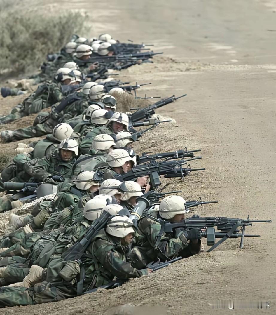 美军当年先进的战术,要是放到现在也是被团灭的命,看这么多人集中在一起,像一个排的兵力。 如果是现在,几架自杀式无人机或者一发精确制导炮弹就解决了,参考俄乌战场,前线现在根本看不到这么多人集中在一起。 当年还是因为伊拉克军队被金钱收买,作战太拉胯了,不然美军这种地面作战方式,不团灭,也要掉层皮。