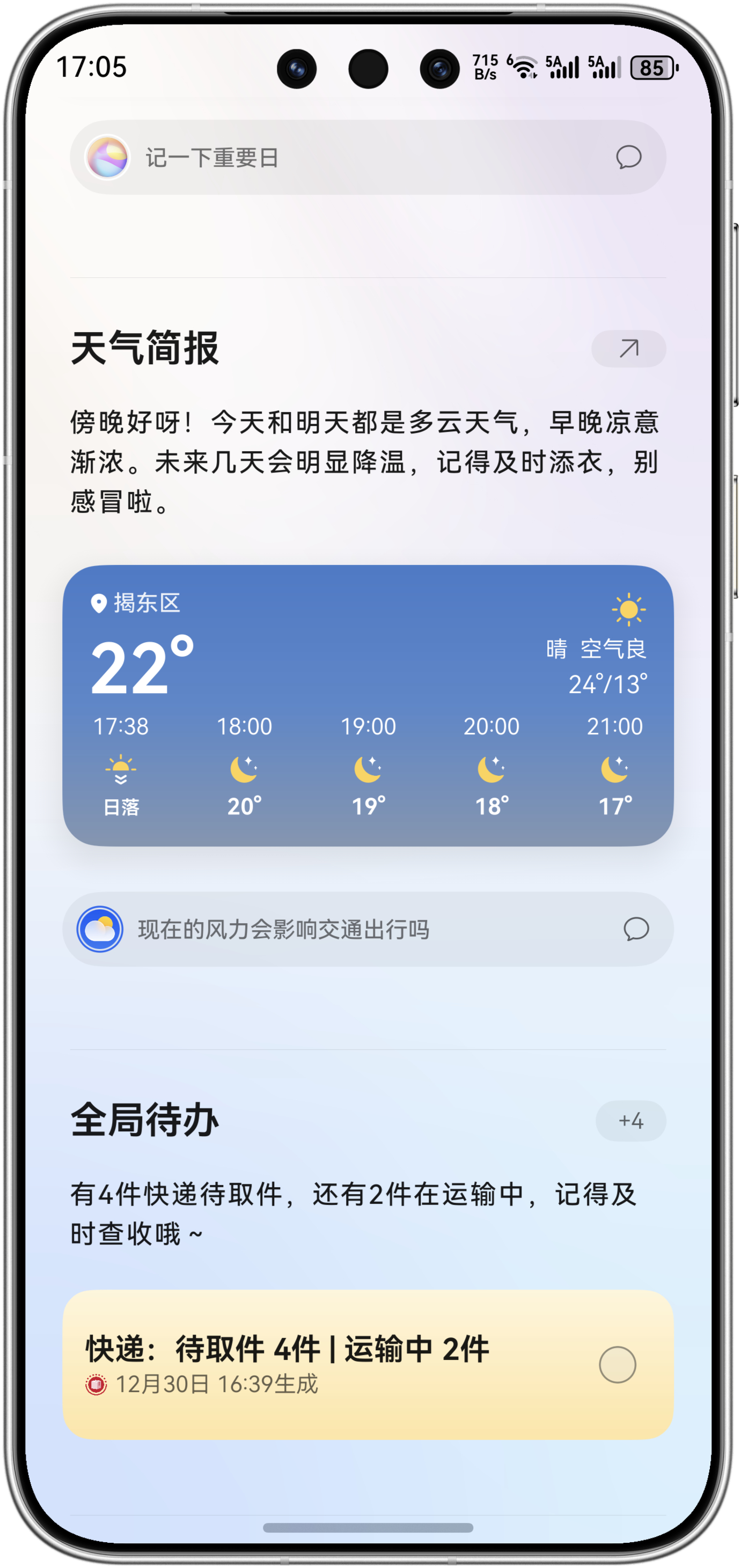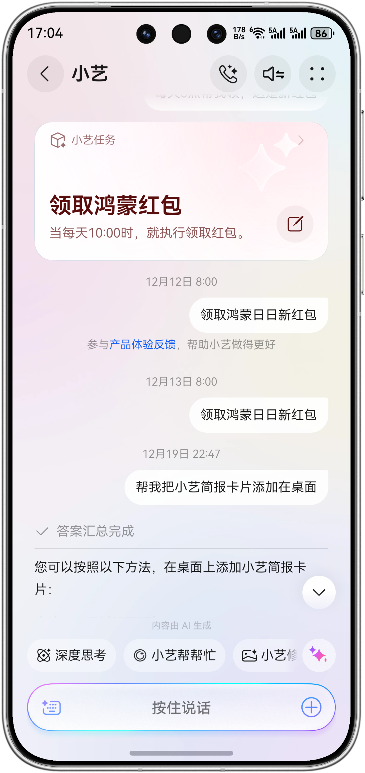 年底了,各种年度报告和推荐也陆续登场,阿华也发布了HarmonyOS功能推荐。话说各位用HarmonyOS的小伙伴,有哪些是你用了就回不去的手机功能 ?最近也一直在用HarmonyOS6 了,要我投票给用了回不去的,我大概有几个:小艺简报、负一屏、元服务,当然也有更聪明的小艺助手。小艺助手现在可以一句话帮你完成很多东西,比如我怕每天忘了领红包(对,还是得薅鸿蒙6的羊毛),所以直接跟小艺说每天10点帮我领鸿蒙日日新红包。然后它就自动生成技能指令了,到点了自动弹提醒并且会跳转到页面,自己只需要点一下就可以,属于是用小艺薅小艺的羊毛了。另外简报功能信息量也确实很对我胃口,每天都会过一眼。负一屏也有我经常需要的信息展示,感觉现在更像是负一屏是我的主屏。还有元服务,特别是在看外卖或者查酒店这一类的,我现在是更习惯打开元服务而不是打开App了。逐渐的习惯了,就真的回不去了。据说现在对着小艺说“鸿人有话奖”,还有惊喜,各位赶紧试试!