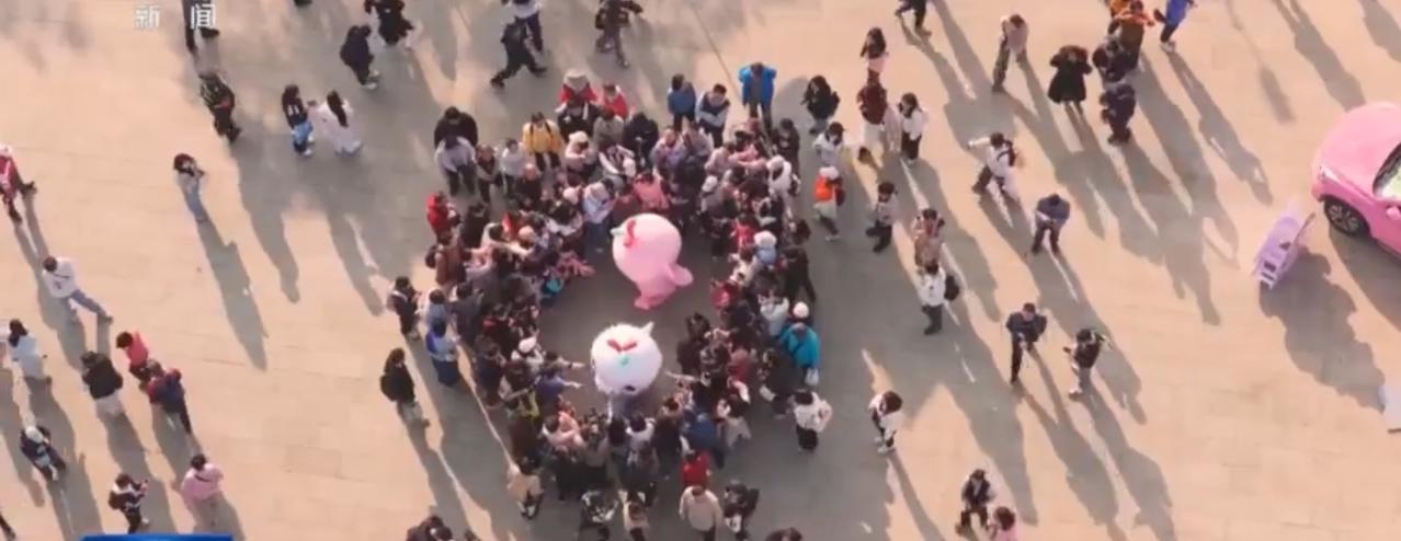 新年的气息在城市里遍地开花,广场上人群簇拥成热闹的人潮,粉色气球在人群中格外显眼