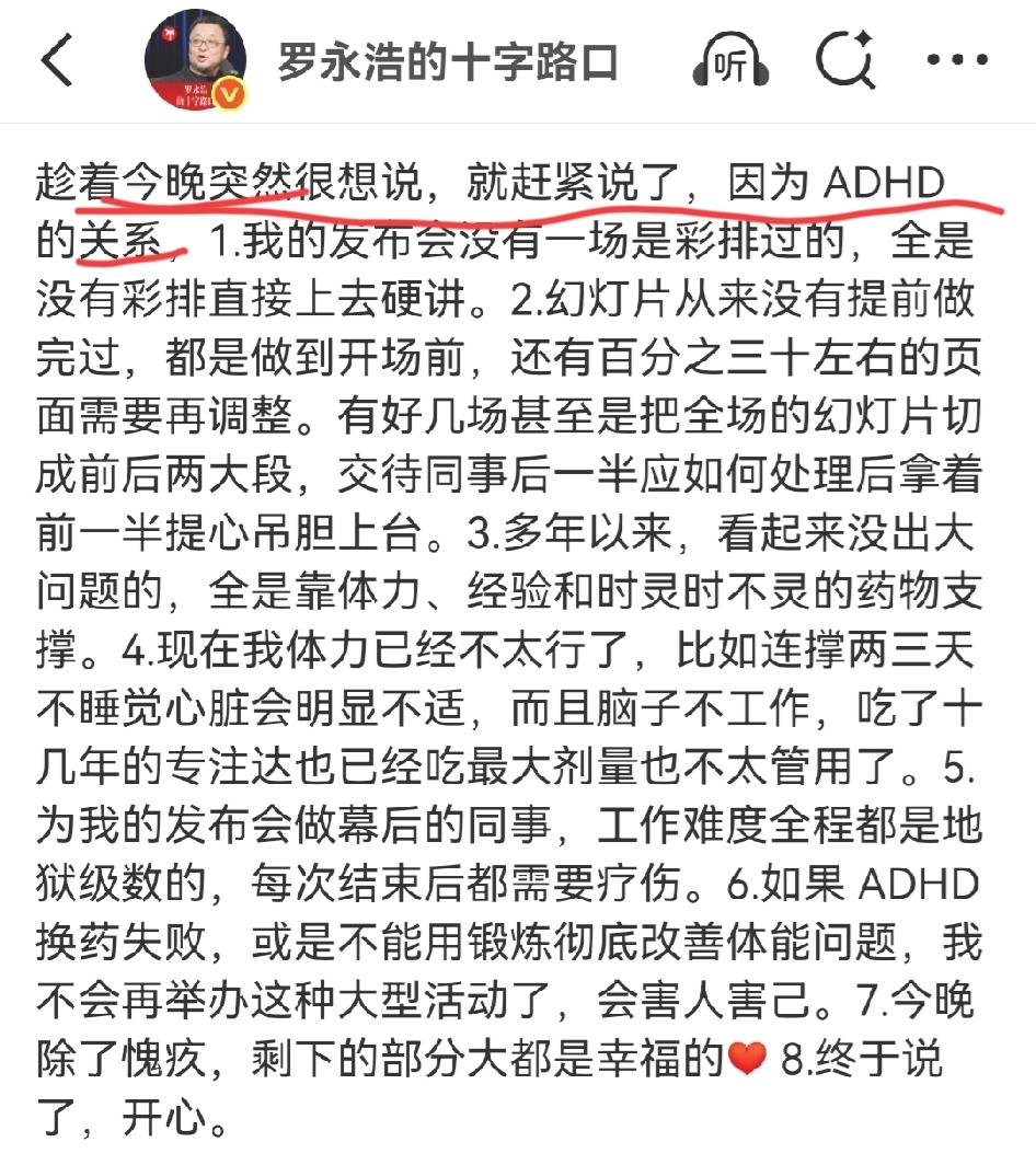 原来罗永浩患有“注意力缺陷和多动症”疾病!长期服用药物!有点理解他较差的情绪控制能力了。也难怪昨晚镜头前的老罗的状态,给我的感觉就像是只“泄了气的球”(上一篇文章写到)。 罗永浩凌晨2点多解释了“科技发布会”迟到50分钟的原因,是因为个人的疾病ADHD(注意力缺陷和多动障碍)! 不过老罗还是一如既往的真性情和豪爽!因为耽误了现场观众的大量时间,影响观看体验!老罗最后宣布昨晚发布会门票全免!原本筹到的慈善资金近167万将由个人承担。 每个人都不完美,但也都有闪光点。