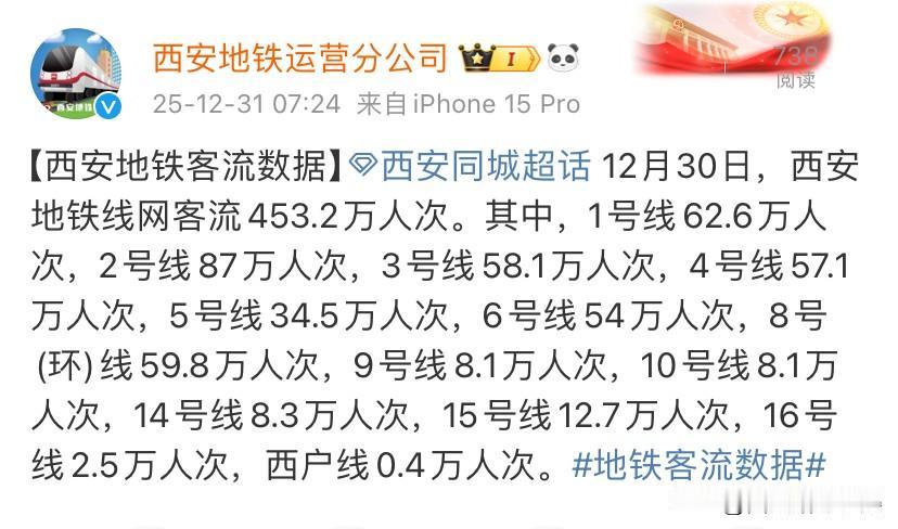 西安地铁15号线开通次日客流暴涨28% 12月30日,西安地铁线网客流达453.2万人次,15号线成最大亮点。开通次日客流12.7万人次,较首日暴涨28.3%,尽显城南居民对这条骨干线的认可。 15号线串联高新、长安、航天新城三大片区,3座车站可换乘2、4、6号线,大幅缩短跨区通勤时间。全自动无人驾驶列车、一站一景的特色车站,更让出行兼具效率与美感,重塑城南出行格局。 具体数据如下: 12月30日,西安地铁线网客流453.2万人次。 客流王者:2号线87万人次,断层领先,串联南北主轴与核心枢纽/景点。 环线中坚:8号线59.8万人次,换乘优势明显,稳居第三。 新线走强:15号线12.7万人次,开通次日较首日(9.9万人次)+28.3%,城南骨干作用凸显。 郊区线:9/10号线各8.1万人次、14号线8.3万人次,客流稳定;16号线2.5万人次、西户线0.4万人次,为线网低位。