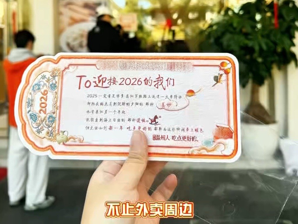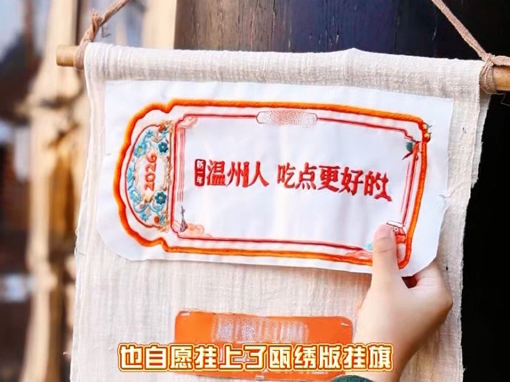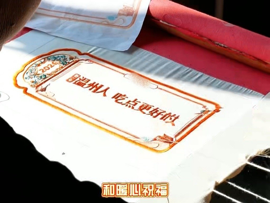 瓯绣年签是送给温州人的新年约定新一年温州人吃点更好的 温州人的外卖里藏着非遗浪漫!餐盒上的瓯绣新年签载满暖心祝福,公交、轻轨、地标全换上同款瓯绣海报,商家也挂起绣纹挂旗。以匠人精神守护品质,为每个温州人递上新年温柔期许~