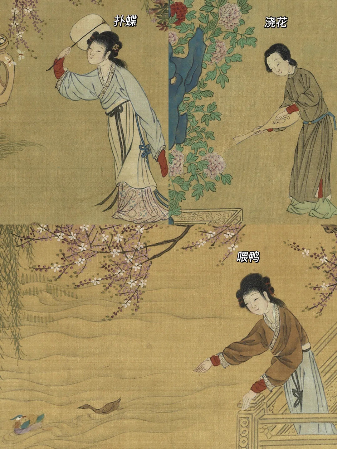 🦋继续向前,有人在室外扑蝶、浇花、喂鸭,享受自然野趣,也有人在室内对弈、读书、谈琴,品味风雅生活。
