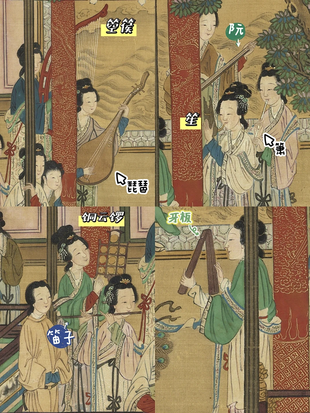 绶带,有的带披帛,围斗篷,有的饰抱肚,持羽扇,仕女们则手举笙、古筝,奔赴前方的音乐会。