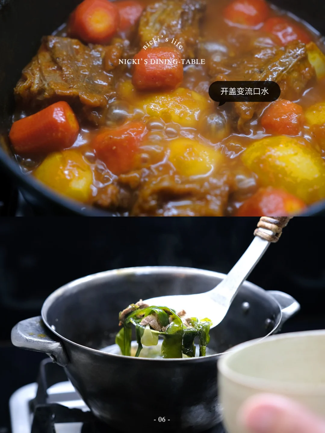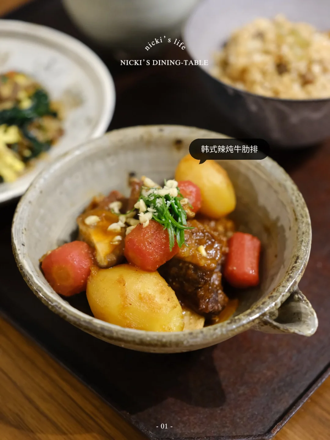 每到年底回想一下今年干了些什么,年头立的flag倒了不少,有在认真坚持的,大概就是做饭了。提前㊗️大家2026新年快乐🎆 - 🔅今日c位菜单:韩式辣炖牛肋排🔅 ·牛肋排冷水下锅,煮15-20分钟后捞出,洗去表面浮沫。 ·准备酱料:一个梨+半个洋葱+几粒大蒜打成泥,加1大勺韩式辣酱、生抽、糖稀、黑胡椒。 ·取一炖锅,放入牛肋排,倒入酱料和开水,盖盖煮3-3个半小时,期间看看水有没有烧干,再加水。 ·放入胡萝卜和土豆,再继续炖煮20分钟。放入香菇,煮10分钟左右转中火收一收汤汁即可。 🥗 菜单: -韩式辣炖牛肋排 -炒杂菜 -海带苗牛肉汤
