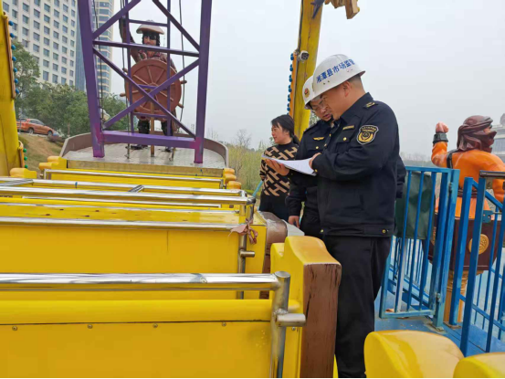 (图为:检查大型游乐设施的运行及维护保养情况)