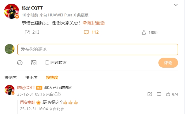 12月31日,陈玘发社媒发文称,极端球迷私信事件已解决,此人已被行政拘留。