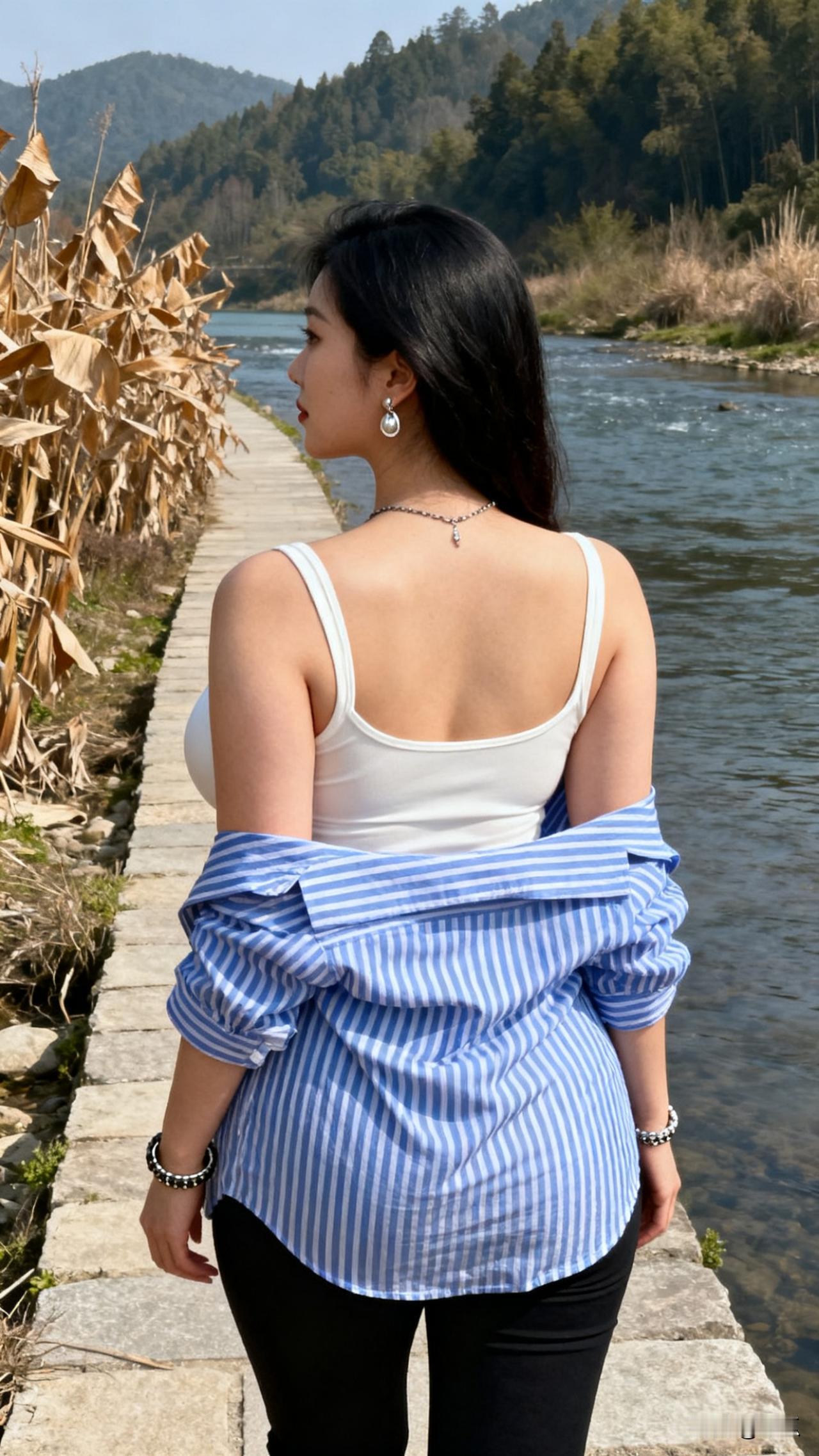 秋日河畔的松弛感,蓝白条纹衫也太出片了吧 谁能拒绝秋日的河畔美景呢?枯黄的芦苇、清透的河水搭配连绵的青山,随手一拍都是氛围感大片~ 穿蓝白条纹衬衫内搭白背心,配黑色长裤,简约的穿搭和自然的景色撞个满怀,站在石步道上、蹲在河水里,每一个瞬间都透着随性的松弛感✨ 原来最美的背景从来都是大自然,不用刻意摆拍,跟着感觉走,就能定格住这份秋日独有的美好~农村姑娘有人喜欢吗? 怎么穿搭才能显得简约且干净