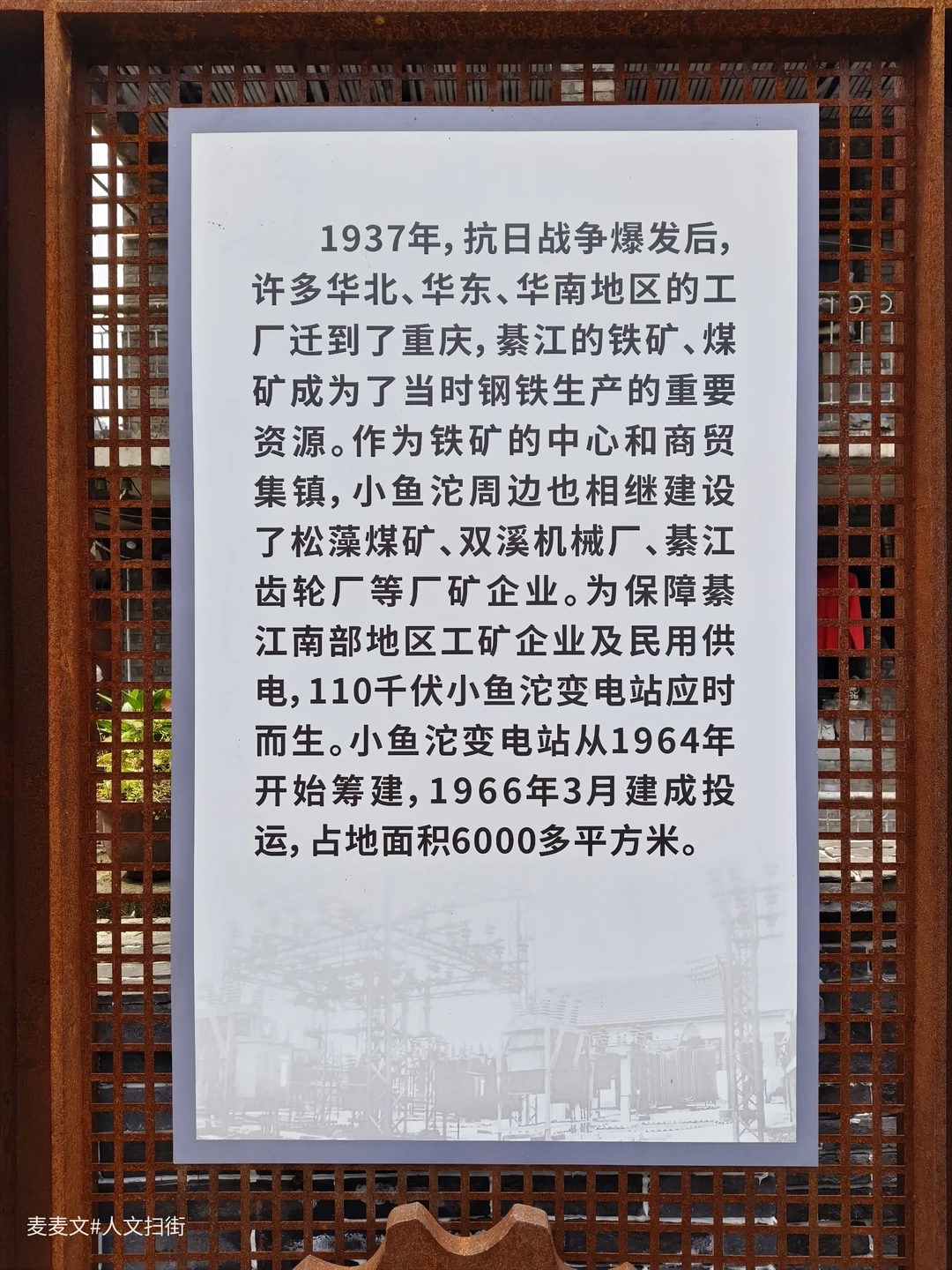 1937年,抗日战争爆发后,许多华北、华东、华南地区的工厂迁到了重庆,綦江的铁矿、煤矿成为了当时钢铁生产的重要资源。作为铁矿的中心和商贸集镇,小鱼沱周边也相继建设了松藻煤矿、双溪机械厂、綦江齿轮厂等厂矿企业。为保障綦江南部地区工矿企业及民用供电,110千伏小鱼沱变电站应时而生。小鱼沱变电站从1964年开始筹建,1966年3月建成投运,占地面积6000多平方米。