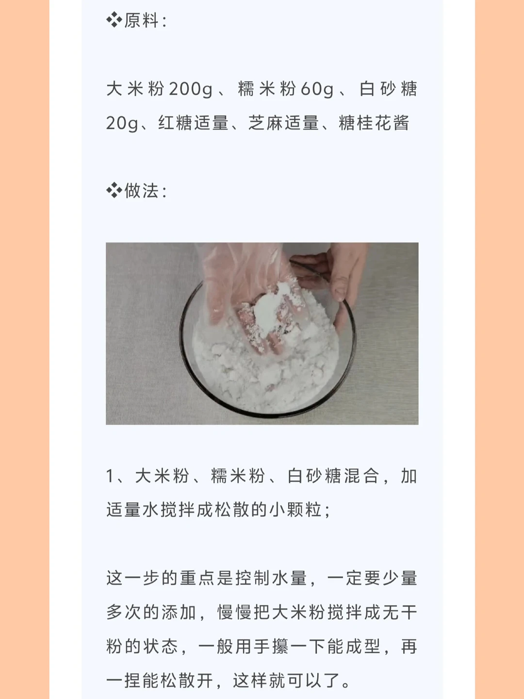 1、大米粉、糯米粉、白砂糖混合,加适量水搅拌成松散的小颗粒;
