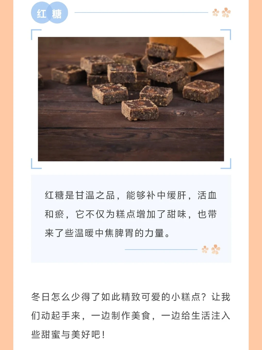 [向右R]红糖是甘温之品,能够补中缓肝,活“红”化瘀,它不仅为糕点增加了甜味,也带来了些温暖中焦脾胃的力量。