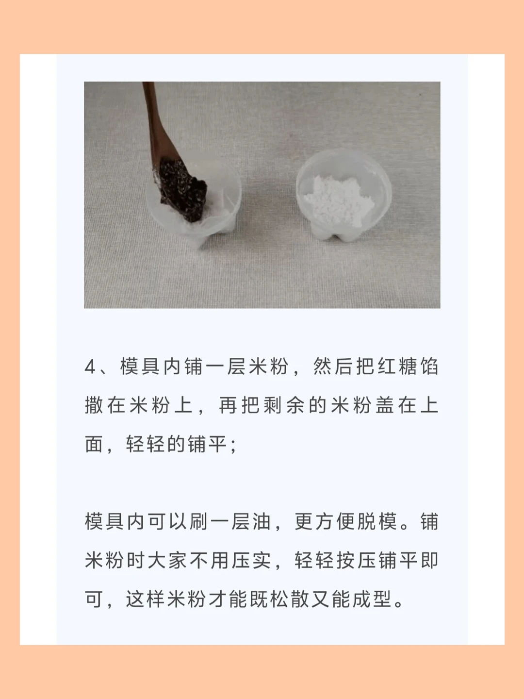 [种草R]模具内可以刷一层油,更方便脱模。铺米粉时大家不用压实,轻轻按压铺平即可,这样米粉才能既松散又能成型。