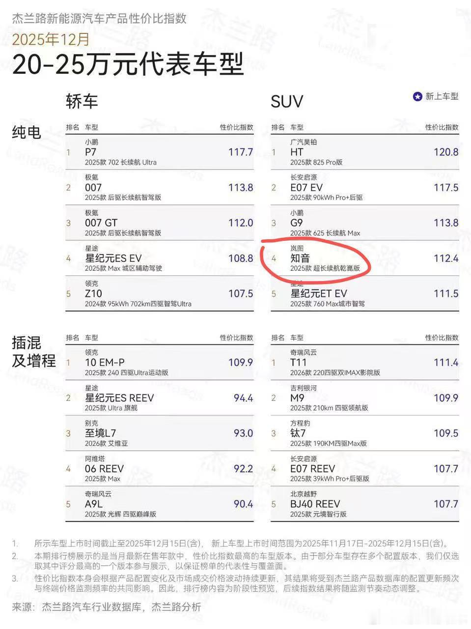 20 万级纯电 SUV,居然已经卷到这个地步在 20–25 万的纯电 SUV 价位带里车型扎堆,我刚刷到杰兰路 12 月性价比榜:全新岚图知音 2025 款超长续航乾崑版排到第4,性价比指数 112.4。这个排名不是偶然,它更像是一种综合匹配度的结果——续航、配置、实际成交价三点合一,不靠噱头。全新岚图知音乾崑版的特点很清晰:数据真、体验全、价格门槛不高,整体感觉就是把账算得明白。放在 20 万级纯电 SUV 的横向对比里,它反而表现得克制且稳妥。如果你正在看这个价位、又不愿被参数或品牌光环左右,把它放进候选清单没错。榜单上的第4是筛选后的结论,剩下的就看你对实车的感受。岚图知音 全新岚图知音 华系汽车 SUV 榜单
