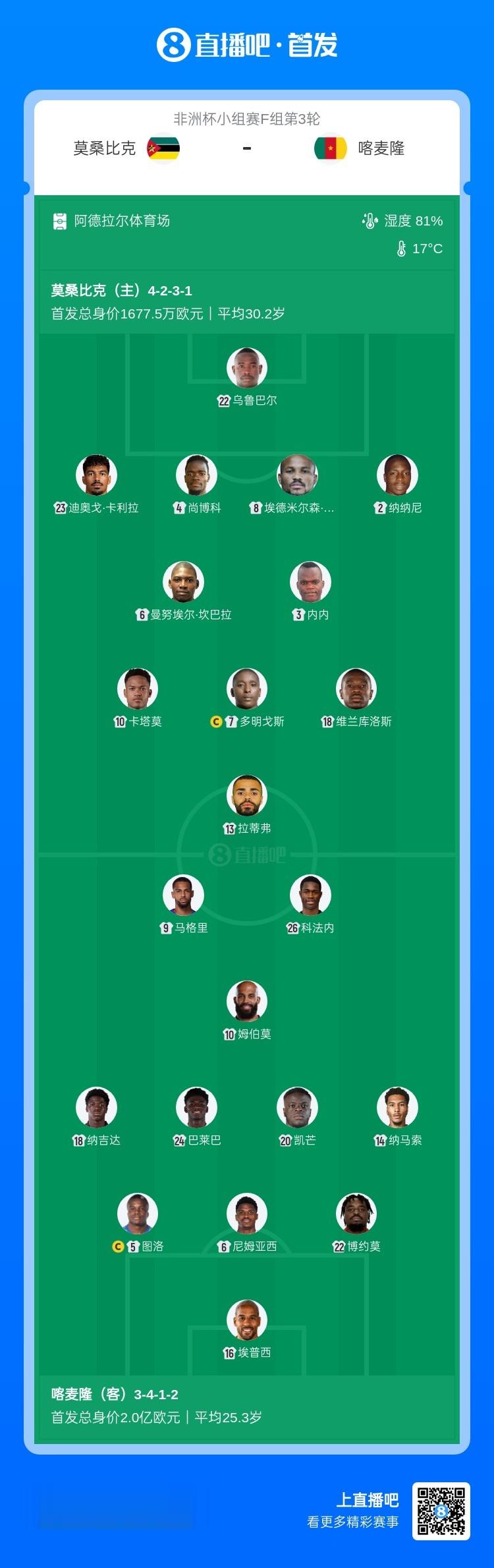 直播吧1月1日讯北京时间今天凌晨3点,非洲杯小组赛F组第3轮,莫桑比克vs喀麦隆,双方首发已经公布。